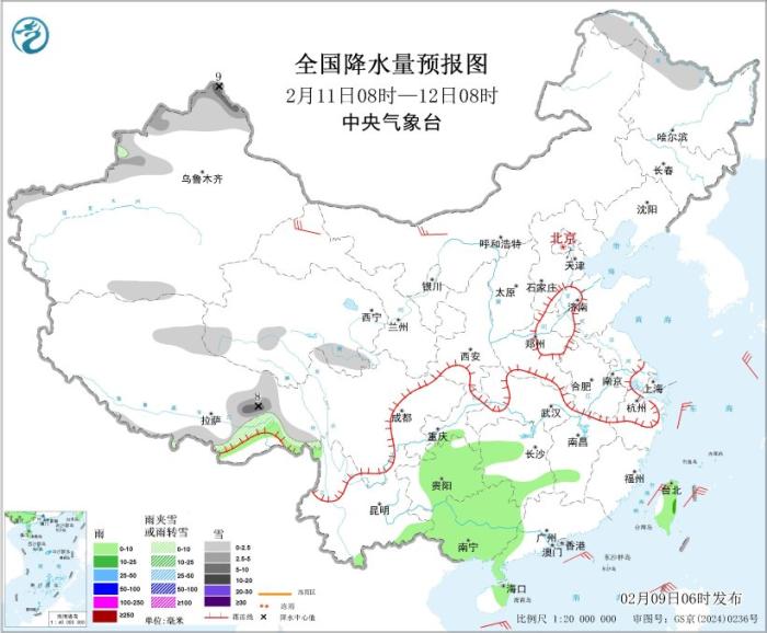 图3 全国降水量预报图(2月10日08时-11日08时)图片来源:中央气象台网站