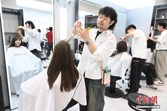 理发师为年轻顾客染发。 中新网记者 刘文华 摄