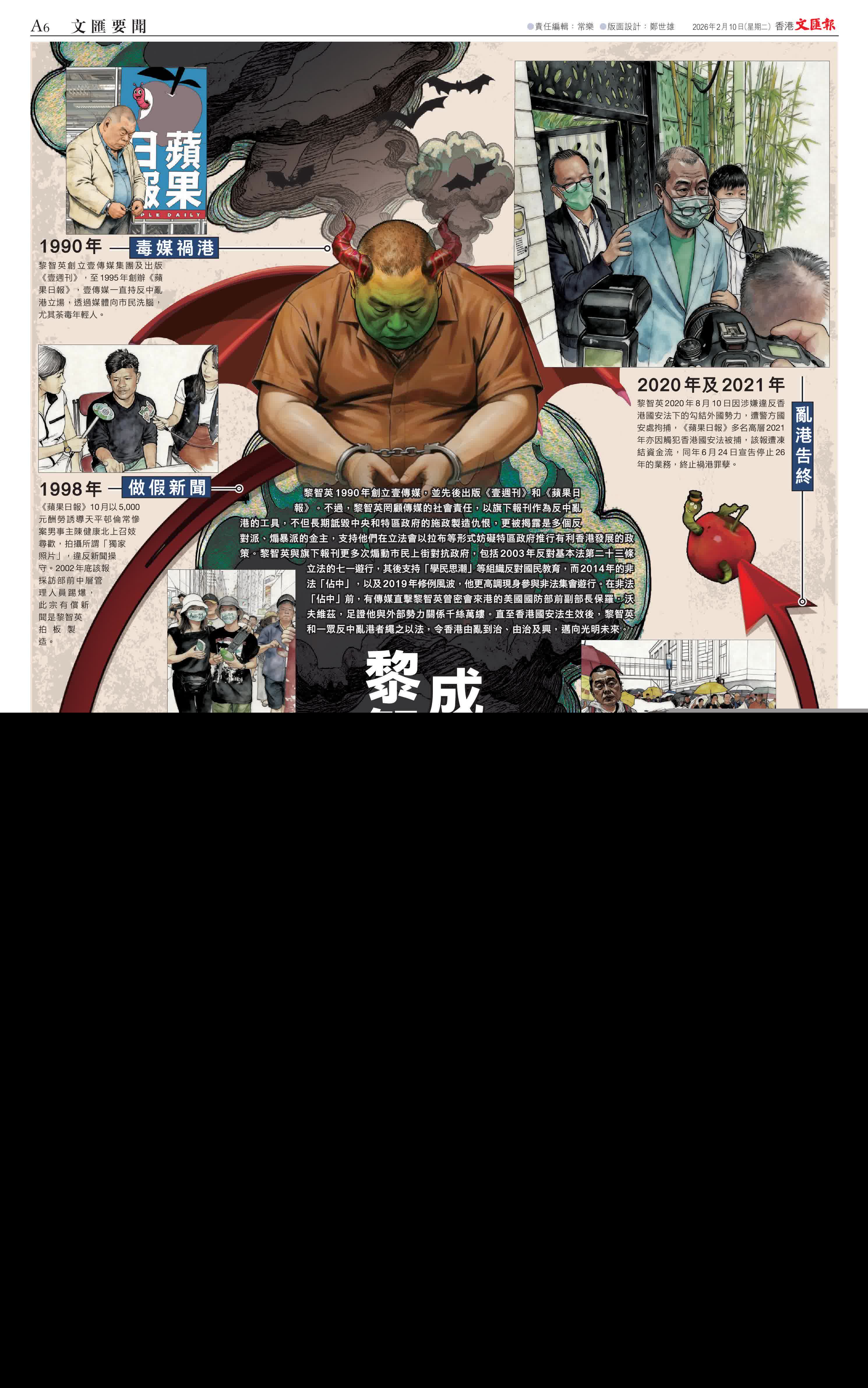 黎智英2020年8月10日因涉嫌違反香港國安法下的勾結外國勢力,遭警方國安處拘捕,《蘋果日報》多名高層2021年亦因觸犯香港國安法被捕,該報遭凍結資金流,同年6月24日宣告停止26年的業務,終止禍港罪孽。