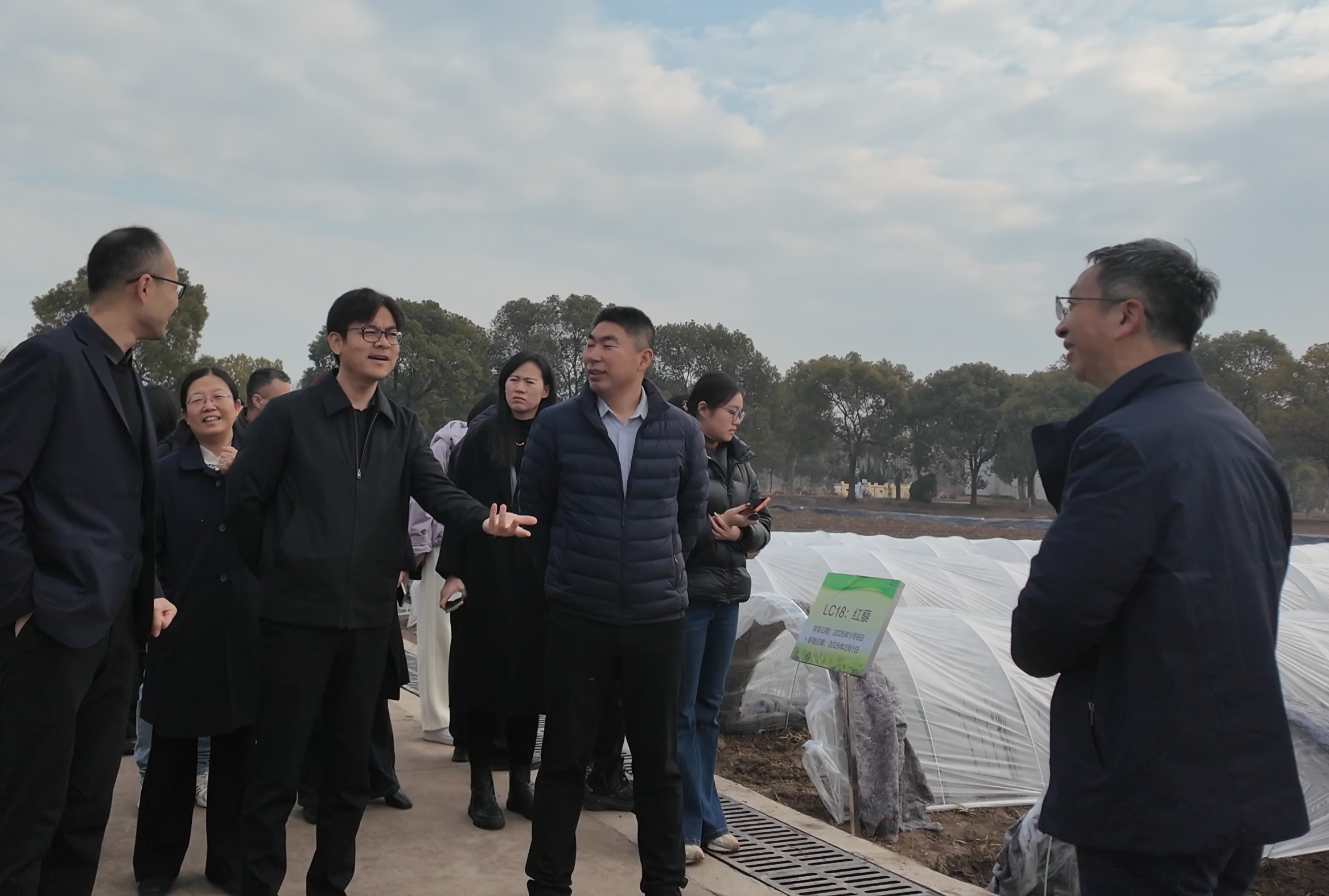在上海市农科院生物所崇明创新基地内,刘成洪(右一)向上海市农科院、上海市农委蔬菜办、上海市农业技术推广服务中心等负责人介绍情况。