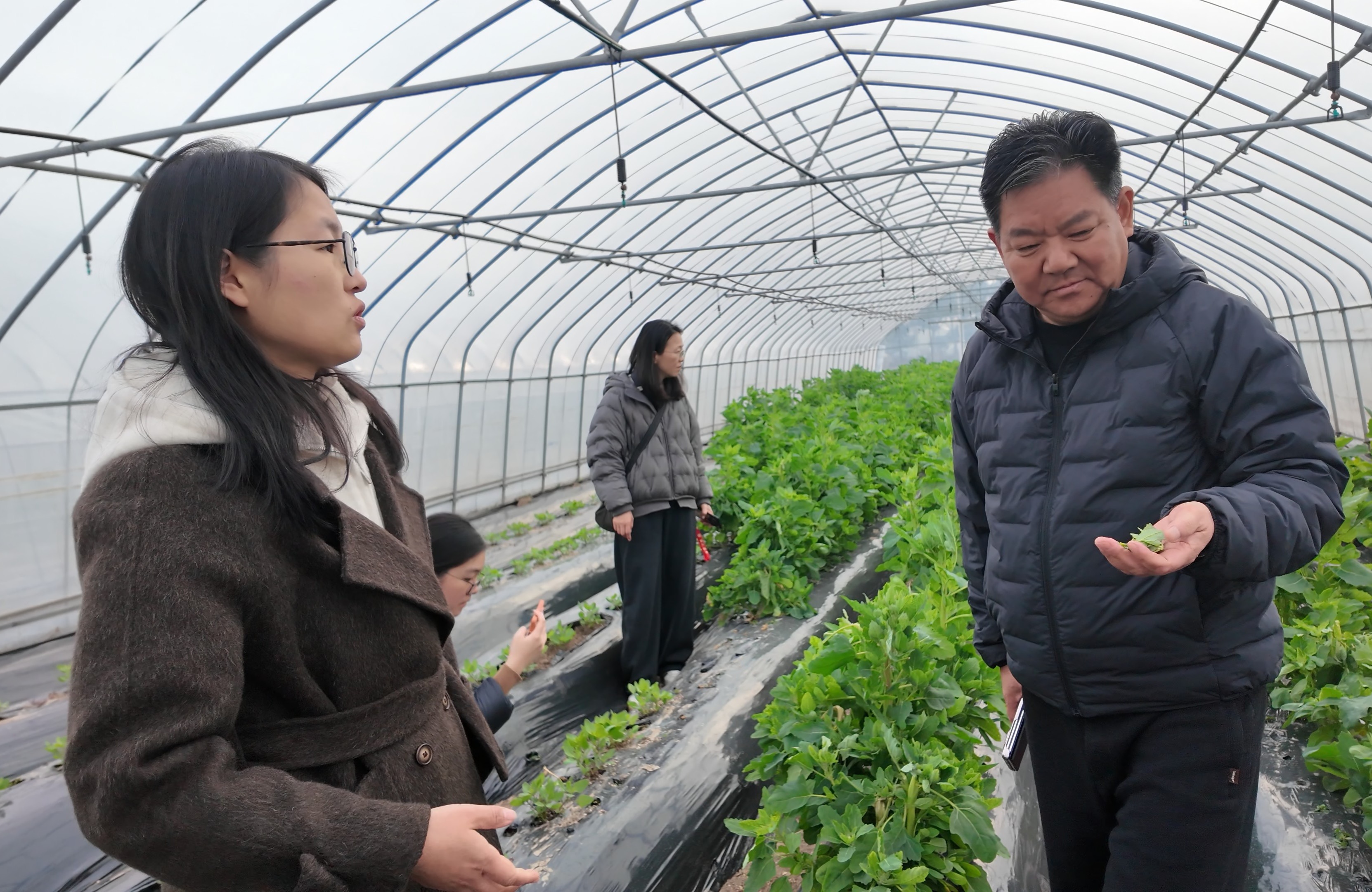 徐红卫副研究员(左一)向前来取经的上海松江区蔬菜经营户樊春强(右一)传经送宝。