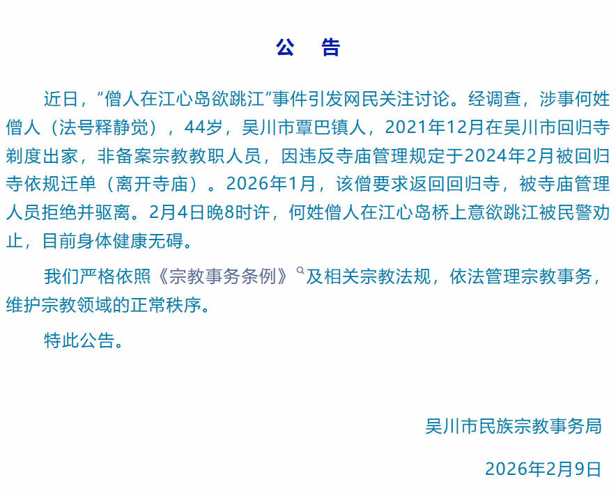 ·广东吴川通报“僧人在江心岛欲跳江”:目前身体健康无碍。