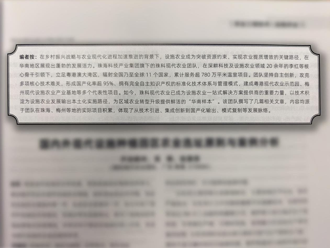 专题“编者按”特别指出,珠科团队以超95%国产化率的标准化技术体系与管理模式,服务全球11国超780万平米温室项目,形成了鲜活的“华南样本”。这标志着“珠科模式”从产业实践迈向学术视野,成为兼具实操性与参考性的行业标杆,也让珠科打造的设施农业全链路解决方案,成为中国现代农业发展进程中的重要参考。