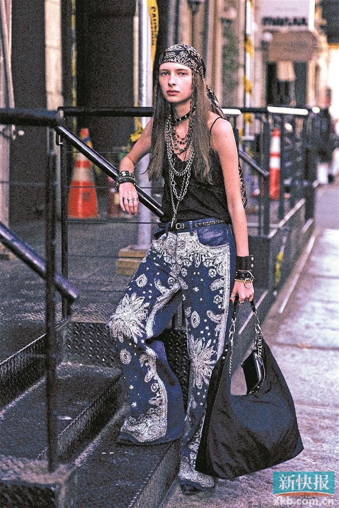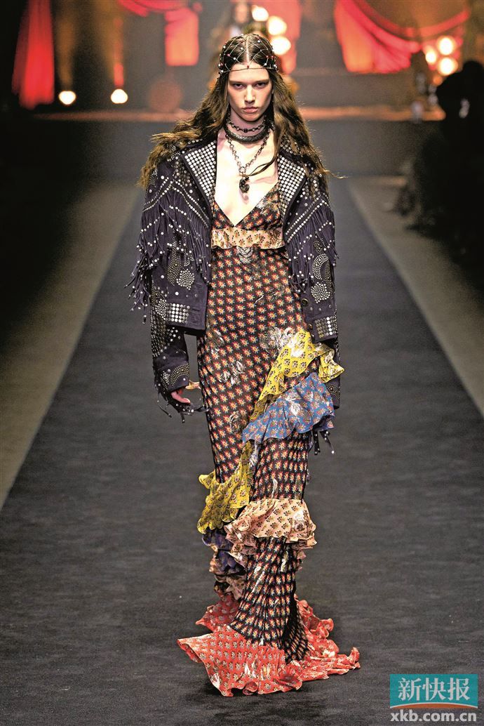 浪漫波嬉中的摇滚民族造型并非直白的朋克叛逆,而是将传统民族元素通过斑驳做旧、文字层叠与暗黑色彩等设计手法巧妙融入摇滚乐的反叛基因,打破民族风情的固有印象,塑造不羁的波西米亚风格。它汲取世界各地民族服饰的精华如印度刺绣、摩洛哥几何图案、墨西哥色彩碰撞等,再融入摇滚风格的利落剪裁与材质对比,形成柔中带刚的独特张力。