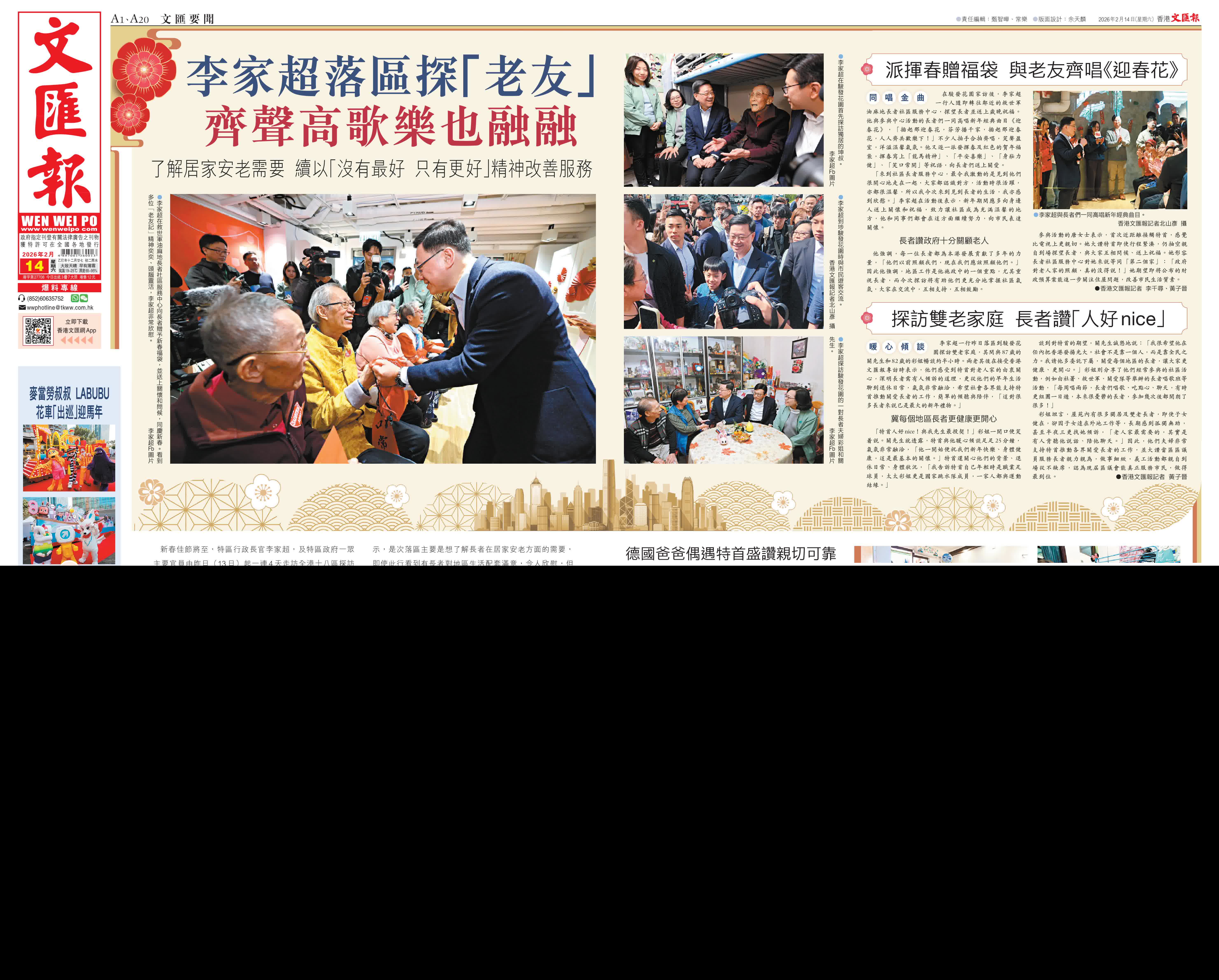 (香港文匯報記者 黃子晉)新春佳節將至,特區行政長官李家超,及特區政府一眾主要官員由昨日(13日)起一連4天走訪全港十八區探訪不同家庭。昨日,李家超先後到訪啟德「啟航1331」的「青年驛站」探望受宏福苑火災影響的居民,以及到油麻地駿發花園家訪長者,又到長者社區服務中心與「老友記」們齊聲高歌,樂也融融。李家超在會見傳媒時表示,是次落區主要是想了解長者在居家安老方面的需要,即使此行看到有長者對地區生活配套滿意,令人欣慰,但特區政府仍會以「沒有最好,只有更好」的精神改善服務。他強調,地區工作是其施政中的一個重點,必須充分掌握社區的氣氛,特別要照顧多年來為香港發展貢獻了力量的長者。