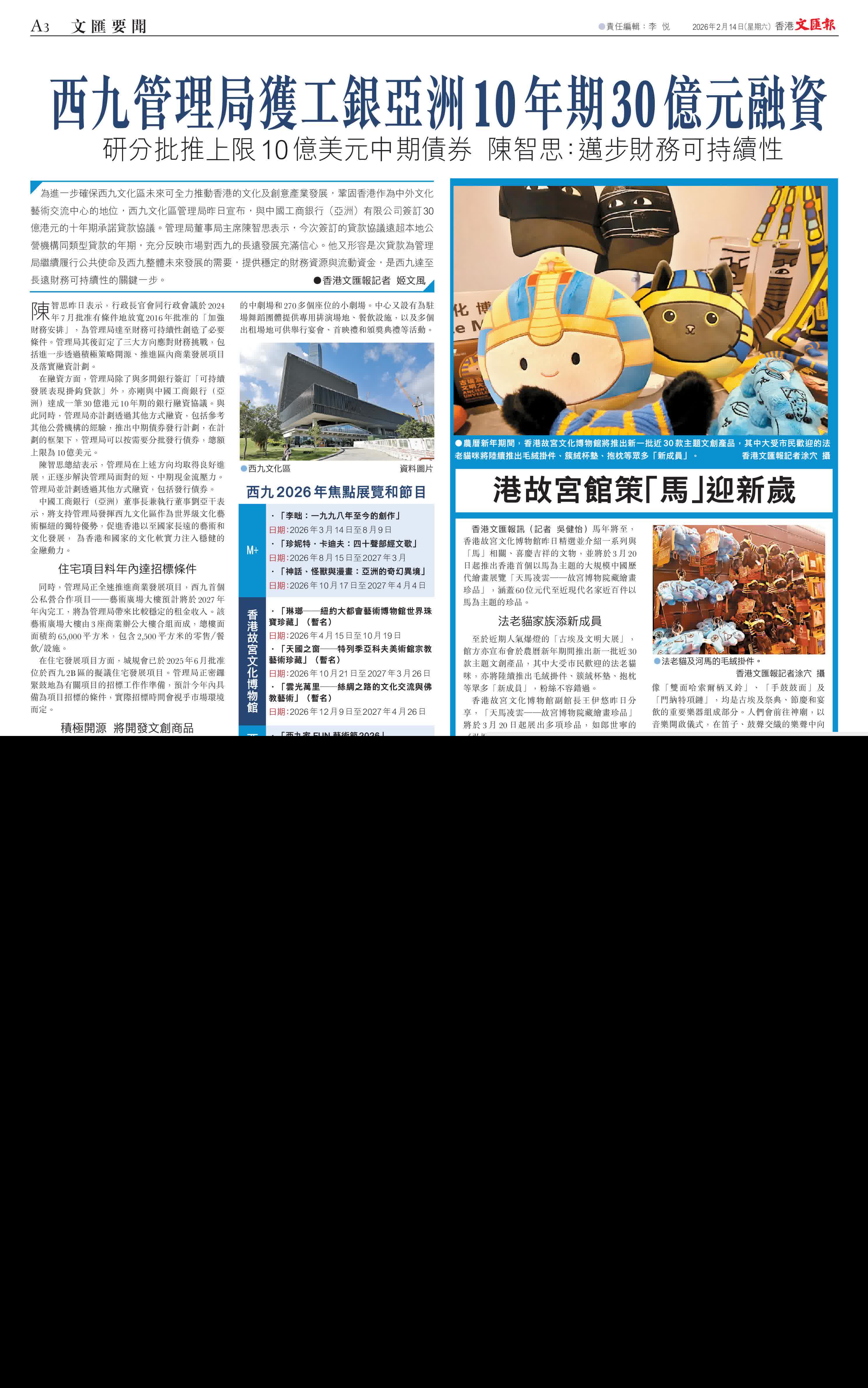 館方又宣布農曆新年期間的特別開放時間,2月17日(年初一)將會休館;2月18日(年初二)於上午9時至下午5時開放;2月19日(年初三)至22日(年初六)開放時間為上午10時至晚上8時,有興趣在新年期間參觀的市民務必留意。