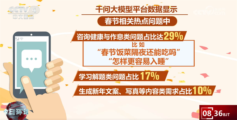 记者在采访中发现,像向昕蕊这样借助AI智能体采购年货的年轻人越来越多。如今的AI早已不只是简单的“问答工具”,而是深度参与人们生活决策的“好帮手”。相关大模型平台数据显示,春节相关热点问题中,咨询健康与作息类问题占比达29%,比如“春节饭菜隔夜还能吃吗”“怎样更容易入睡”;学习解题类问题占比17%;生成新年文案、写真等内容类需求占比10%。此外,“帮我制定春节旅游计划”“帮我订机票”“帮我写新春祝福文案”等高频请求也持续攀升。