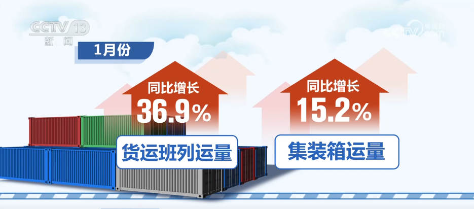 物流产品供给优质高效。1月份,货运班列运量同比增长36.9%;集装箱运量同比增长15.2%;铁水联运量完成155.5万标箱,同比增长15.3%,有力支持建设全国统一大市场。