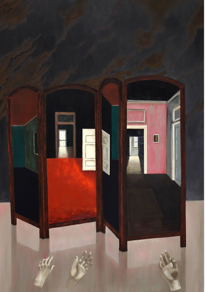 安德森经常会仔细描绘房间中的墙面、楼梯、桌椅、画框延展出的不同面向和透视角度,营造出多重空间感,尤其是她比其他画家更喜欢用镜子、画中画等元素构织复杂的空间,将封闭的室内环境延伸向更远的空间与想象。大大小小的“镜子”可能折射出其他房间或是一幅风景的投射,而一块块“黑色块”既可以看做是一块地面,一块墙面,一个窗口,也可以是某种心理黑洞。
