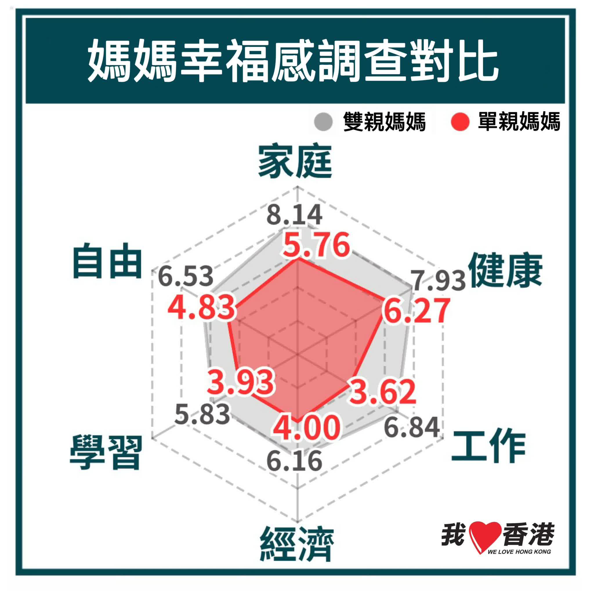 調查顯示,雙親家庭媽媽幸福感平均達6.9分(10分滿分),所有項目均合格且家庭生活評分最高;而單親家庭媽媽整體評分僅4.73分,未達合格線,僅健康狀況評分相對較高,其餘項目平分均不合格。兩者在事業發展、家庭生活及經濟狀況上的差距最為突出。