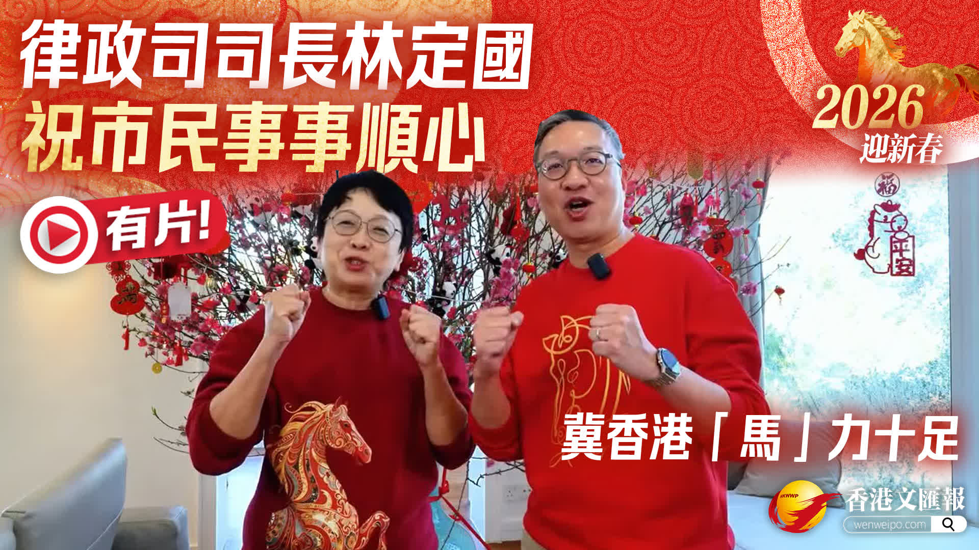 律政司司長林定國與夫人今日(16日)向市民拜年,祝願市民馬年事事順心,冀香港「馬」力十足,乘勢而上,跑得更快更遠。林定國在社交平台發文指,今日為年廿九,相信市民都忙着準備今晚的團圓飯,一家大小歡聚一堂,共享天倫之樂。他和太太祝願各位市民馬年事事順心,「馬」到功成,笑口常開;精神奕奕,龍「馬」精神。更希望香港「馬」力十足,乘勢而上,跑得更快更遠,開創更美好格局。同時,他祝願國家繁榮昌盛、國泰民安。