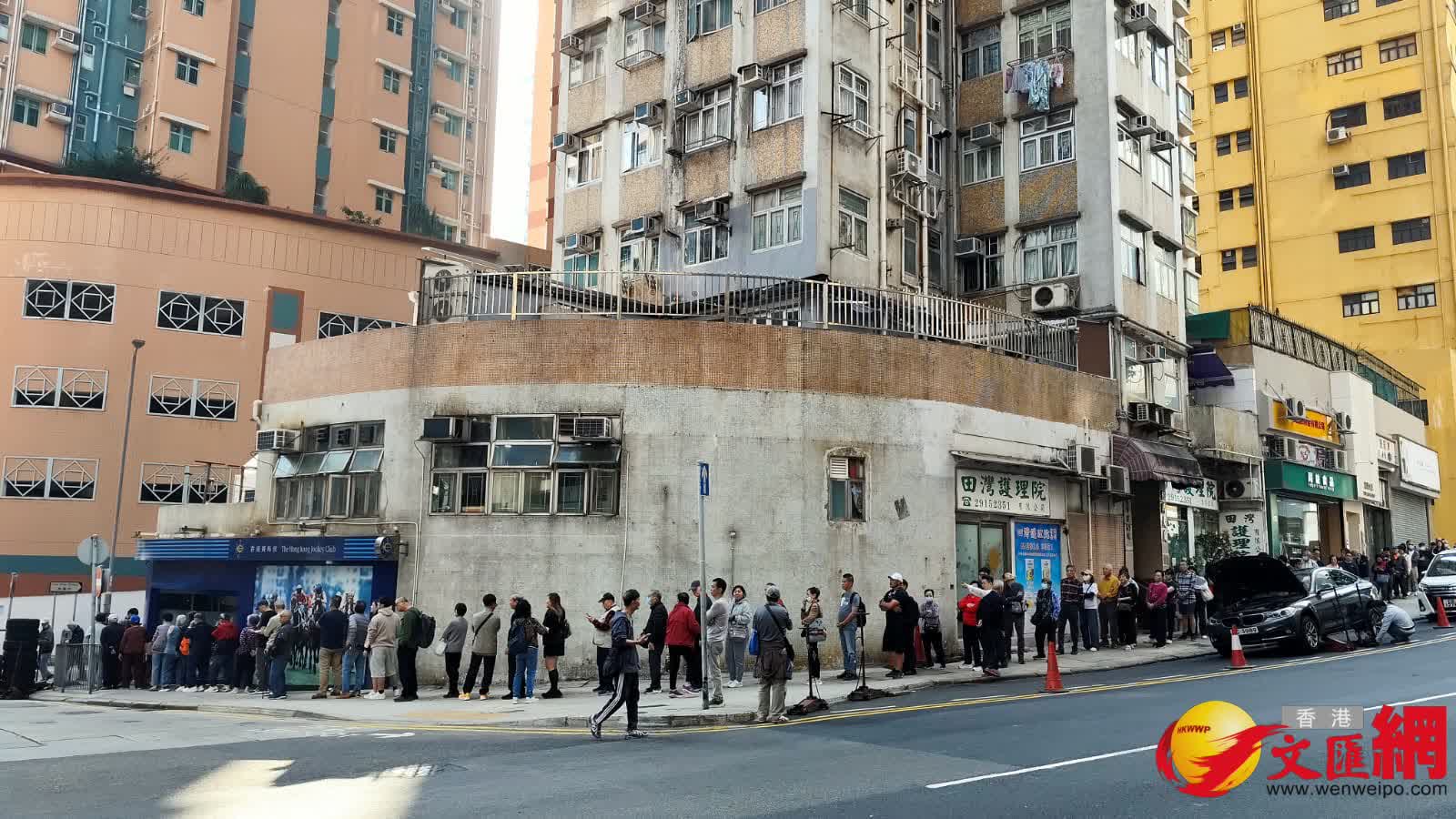 今日下午,香港文匯報記者到達多區視察,但見也出現排隊人龍,其中「最旺投注站」中環士丹利街投注站,雖然距離截止投注還有不足4小時,但見投注站的排隊人龍轉彎延伸至德己立街「長不見尾」,估計人數多達近千人,一度需要排隊達60分鐘始購得彩票。另外,香港仔田灣漁歌街投注站雖然十大幸運投注處榜上無名,但同樣大排長龍,人龍轉彎延伸至石排灣道,估計有逾百人。