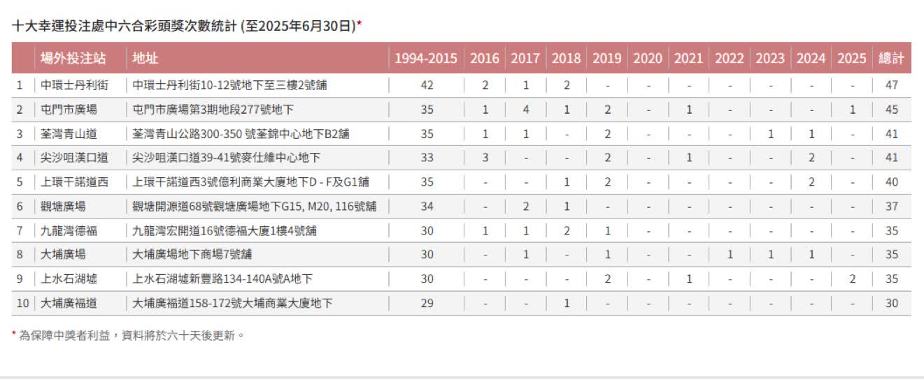 根據馬會十大幸運投注處中六合彩頭獎次數統計資料,中環士丹利街投注站繼續以47次頭獎居首位,惟自2019年至2025年間已未有再售出頭獎彩票,被排第二名的屯門市廣場投注站「急起直追」下,兩處投注站僅相差兩次頭獎。