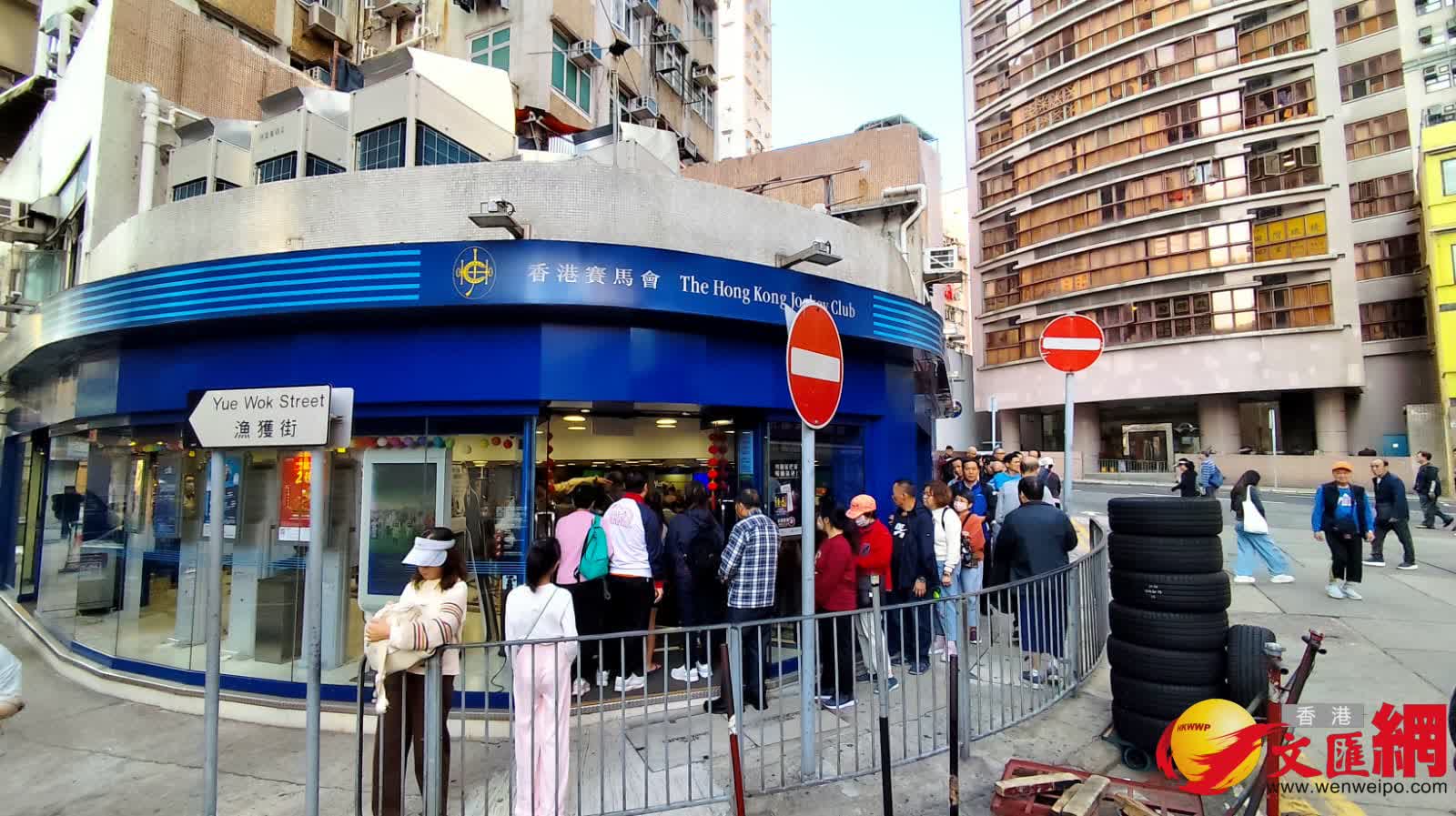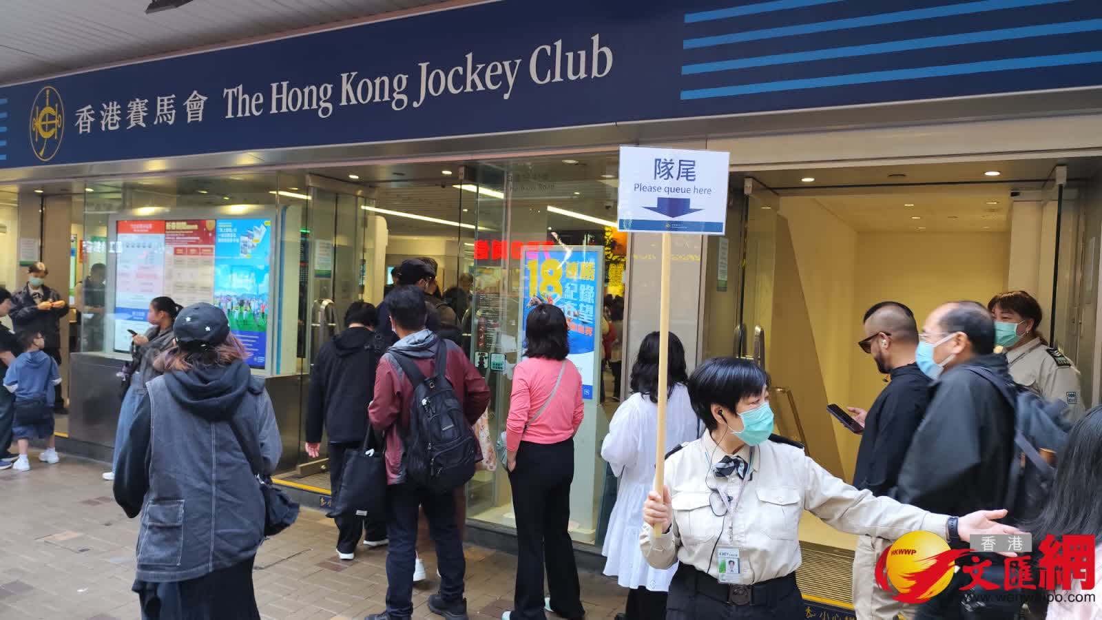 九龍方面,不同地區的馬會投注站同樣人頭湧湧,香港文匯報記者分別到達尖沙咀河內道投注站及旺角花園街16號投注站了解,但見同樣出現長長人龍,估計有數百人;其中河內道投注站馬會職員需要在投注站外手持指示牌維持秩序。