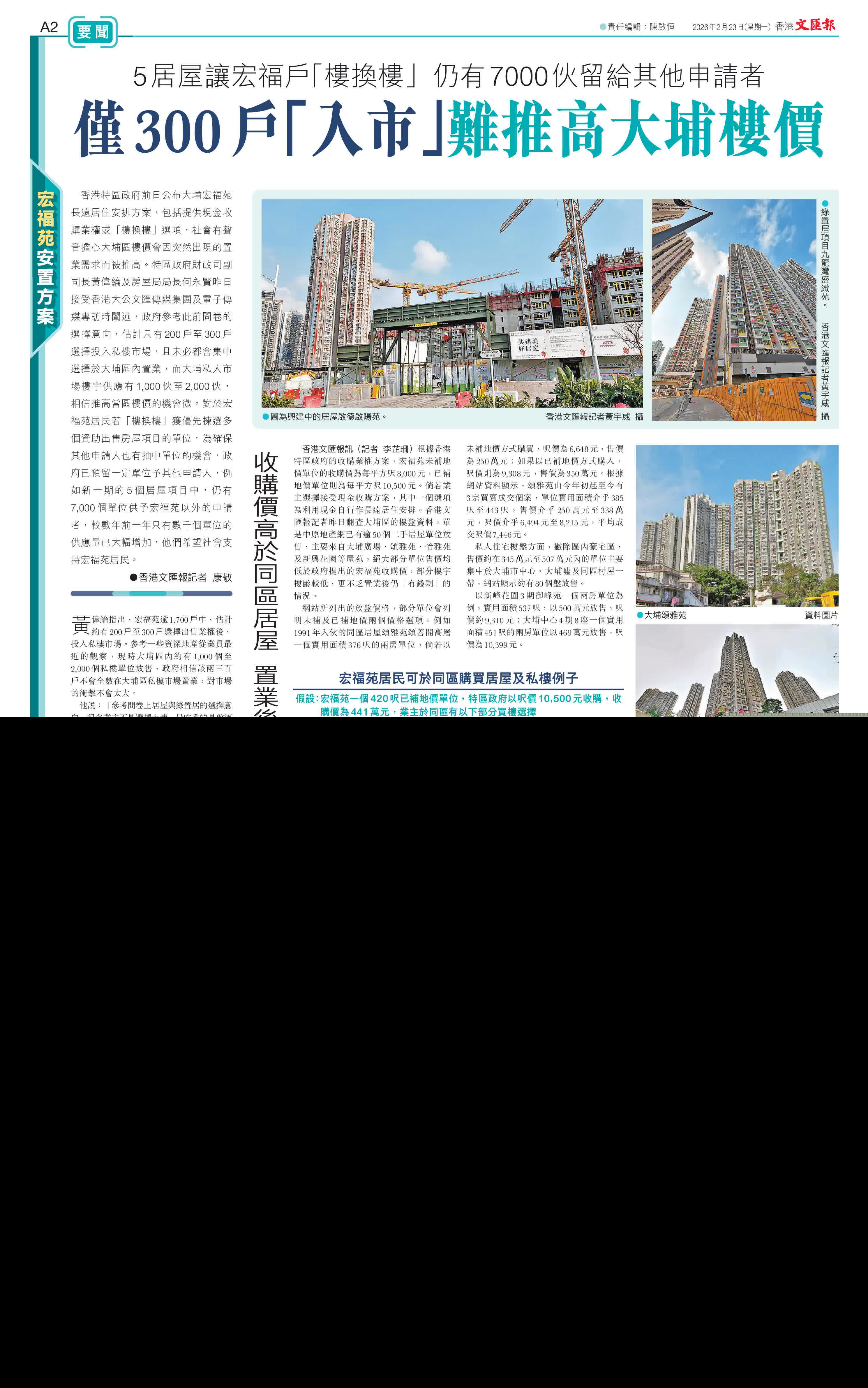 (香港文匯報記者 康敬)香港特區政府前日公布大埔宏福苑長遠居住安排方案,包括提供現金收購業權或「樓換樓」選項,社會有聲音擔心大埔區樓價會因突然出現的置業需求而被推高。特區政府財政司副司長黃偉綸及房屋局局長何永賢昨日接受香港大公文匯傳媒集團及電子傳媒專訪時闡述,政府參考此前問卷的選擇意向,估計只有200戶至300戶選擇投入私樓市場,且未必都會集中選擇於大埔區內置業,而大埔私人市場樓宇供應有1,000伙至2,000伙,相信推高當區樓價的機會微。對於宏福苑居民若「樓換樓」獲優先揀選多個資助出售房屋項目的單位,為確保其他申請人也有抽中單位的機會,政府已預留一定單位予其他申請人,例如新一期的5個居屋項目中,仍有7,000個單位供予宏福苑以外的申請者,較數年前一年只有數千個單位的供應量已大幅增加,他們希望社會支持宏福苑居民。
