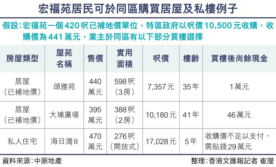 (記者 李芷珊)根據香港特區政府的收購業權方案,宏福苑未補地價單位的收購價為每平方呎8,000元,已補地價單位則為每平方呎10,500元。倘若業主選擇接受現金收購方案,其中一個選項為利用現金自行作長遠居住安排。香港文匯報記者昨日翻查大埔區的樓盤資料,單是中原地產網已有逾50個二手居屋單位放售,主要來自大埔廣場、頌雅苑、怡雅苑及新興花園等屋苑,絕大部分單位售價均低於政府提出的宏福苑收購價,部分樓宇樓齡較低,更不乏置業後仍「有錢剩」的情況。