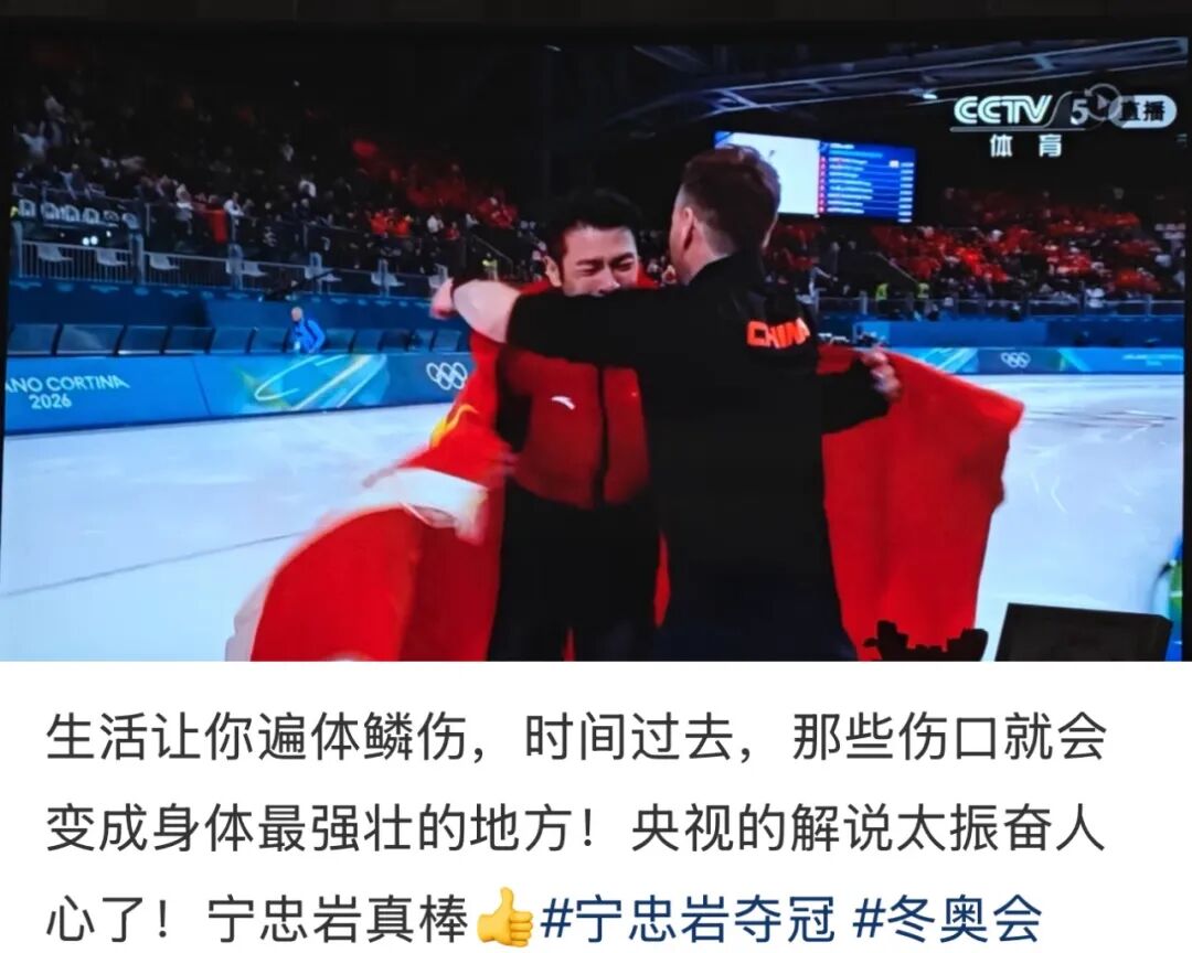 “宁忠岩用自己的行动印证,生活总会让你遍体鳞伤,但时间过去,你总会把那些伤口,变成你身上最强壮的地方!新的速滑冠军诞生、新的奥运纪录诞生!”