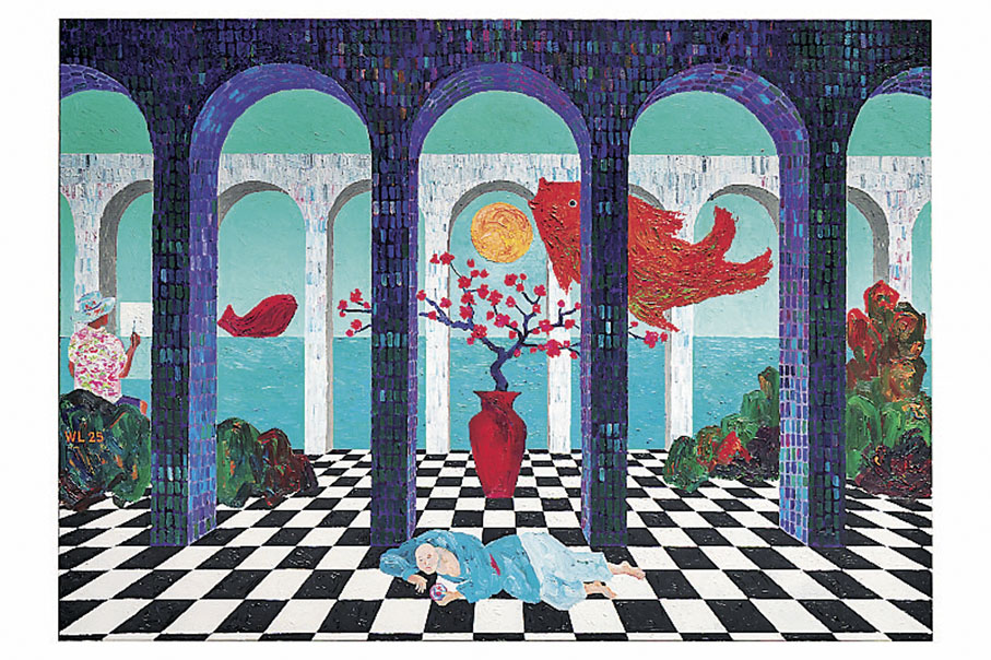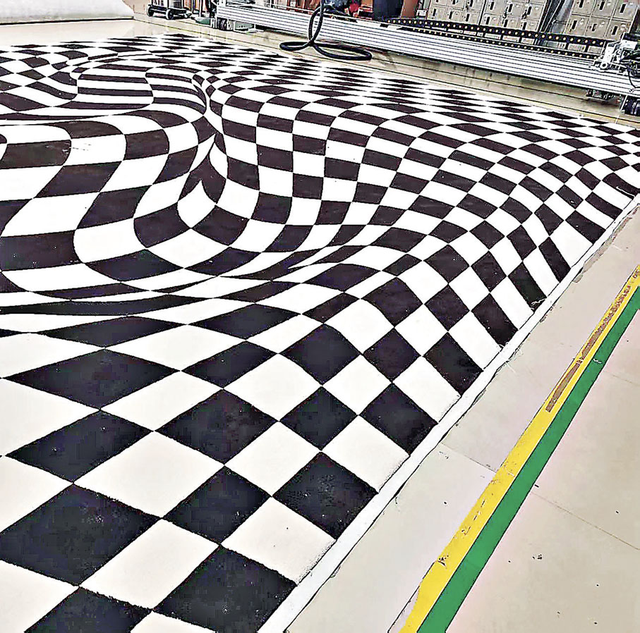 香港建築師兼藝術家林偉而與太平地氈合作的作品,靈感源自林氏的油畫《A Bright Future》,把露台咖啡廳幻化成奇妙空間——一幅大型手織牆氈與太平地氈工藝師精心製作的無縫格紋地氈結合,營造出疑幻疑真的氛圍,讓參觀人士感覺彷彿直接踏進了畫布世界。