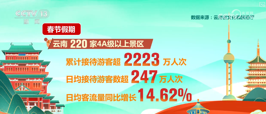 记者从云南省文化和旅游厅了解到,春节假期,全省220家4A级以上景区累计接待游客超2223万人次,日均接待游客超247万人次,日均客流量同比增长14.62%。接待游客量位居前五位的分别是:丽江古城、大理古城、昆明官渡古镇、昆明市翠湖·讲武堂和告庄西双景。
