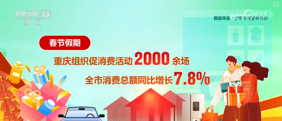 重庆市商务委员会消息,春节假期,重庆围绕“购在中国·爱尚重庆”主题,聚焦吃、住、行、游、购、娱六大元素,组织促消费活动2000余场,全市消费总额同比增长7.8%。其中,商品零售额同比增长7.1%、服务零售额同比增长8.5%、夜间消费额同比增长7.9%。中心城区20个重点商圈销售总额同比增长6.5%,消费市场实现新春“开门红”。