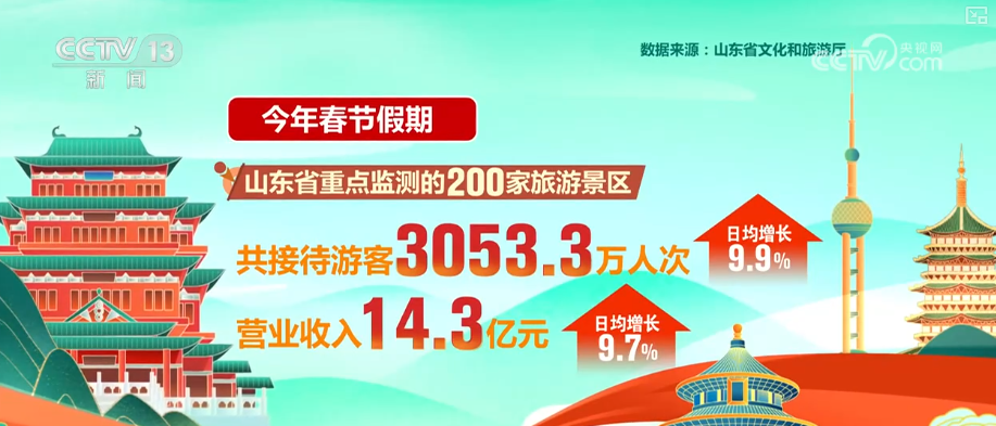 记者从山东省文化和旅游厅了解到,2026年春节假期,截至2月23日15时,山东省重点监测的200家旅游景区共接待游客3053.3万人次,营业收入14.3亿元,日均分别增长9.9%和9.7%。其中,接待游客的最高峰为21日大年初五,当日共计接待游客463.5万人次,营业收入2.2亿元。