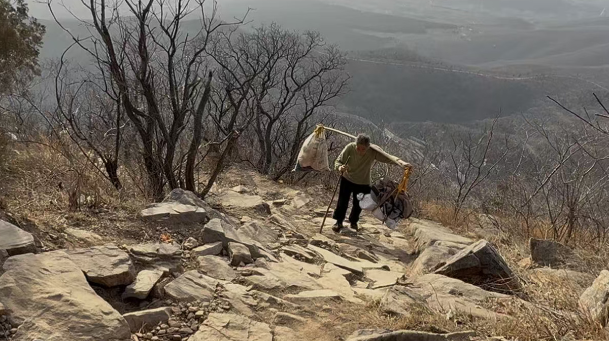 其间,记者感觉精疲力尽,多次停下脚步,注意到这处险要突出的巨石上,还残留着黑黄交错的斑渍。一旁的蔡冠杰说,这是早年间体力耗尽的挑山工,不能把重达百斤的建站水泥放下,只能肩扛着倚靠在石头上歇息留下的印记。汗水和水泥常年累月浸染,至今未退 。