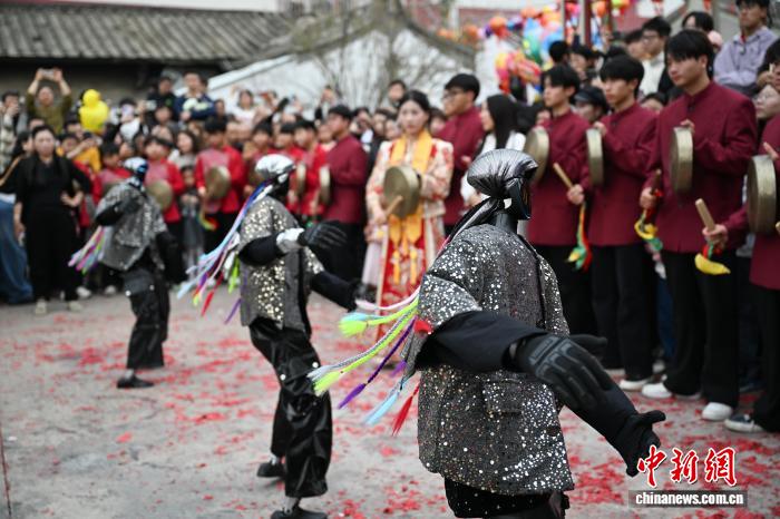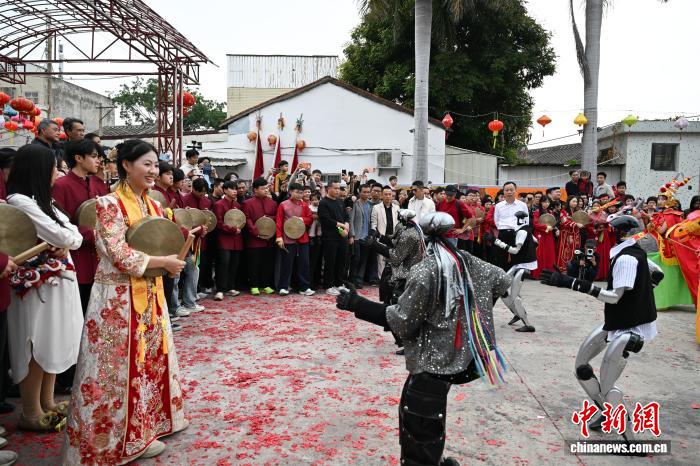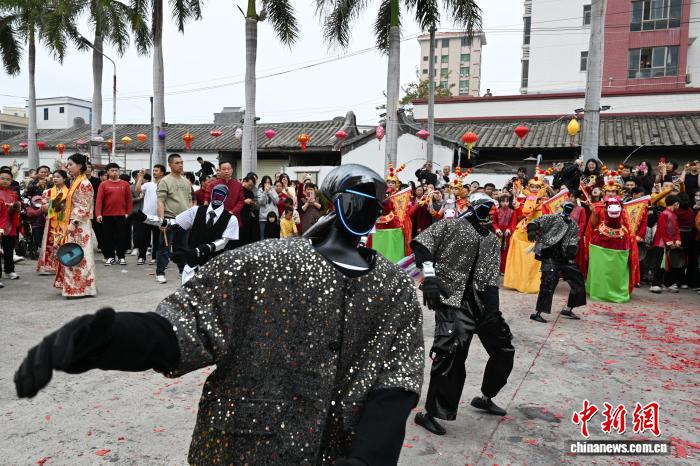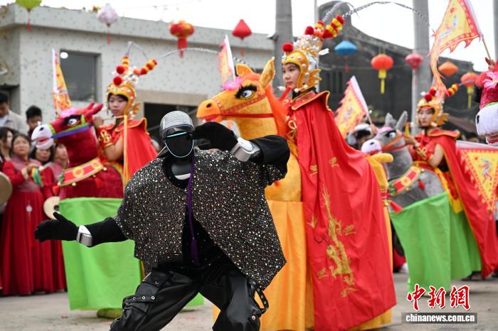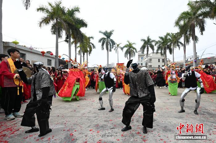 2月24日,广东省潮州市田头何村开展民俗巡游活动,机器人与布马舞舞者共舞,吸引村民观看。中新社记者 陈楚红 摄