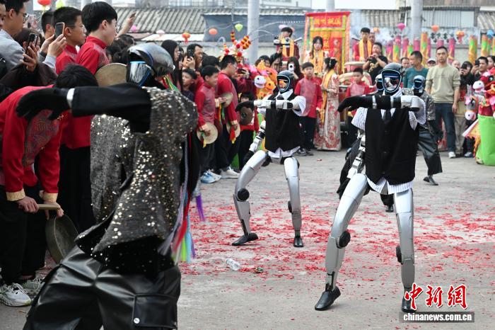 2月24日,广东省潮州市田头何村开展民俗巡游活动,机器人在潮州音乐的伴奏下起舞,吸引村民观看。中新社记者 陈楚红 摄