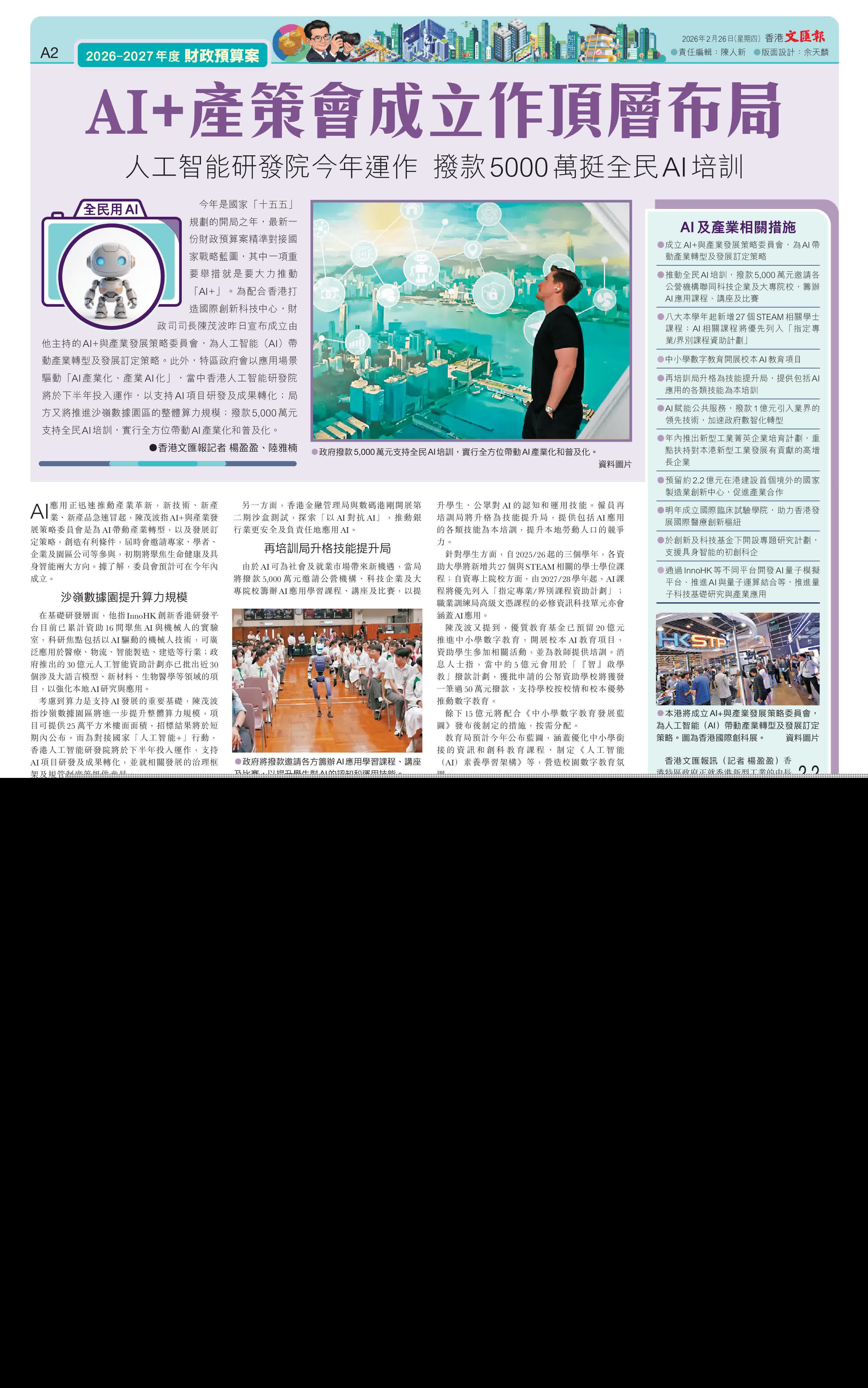 (香港文匯報記者 楊盈盈、陸雅楠)今年是國家「十五五」規劃的開局之年,最新一份財政預算案精準對接國家戰略藍圖,其中一項重要舉措就是要大力推動「AI+」。為配合香港打造國際創新科技中心,財政司司長陳茂波昨日宣布成立由他主持的AI+與產業發展策略委員會,為人工智能(AI)帶動產業轉型及發展訂定策略。此外,特區政府會以應用場景驅動「AI產業化、產業AI化」,當中香港人工智能研發院將於下半年投入運作,以支持AI項目研發及成果轉化;局方又將推進沙嶺數據園區的整體算力規模;撥款5,000萬元支持全民AI培訓,實行全方位帶動AI產業化和普及化。