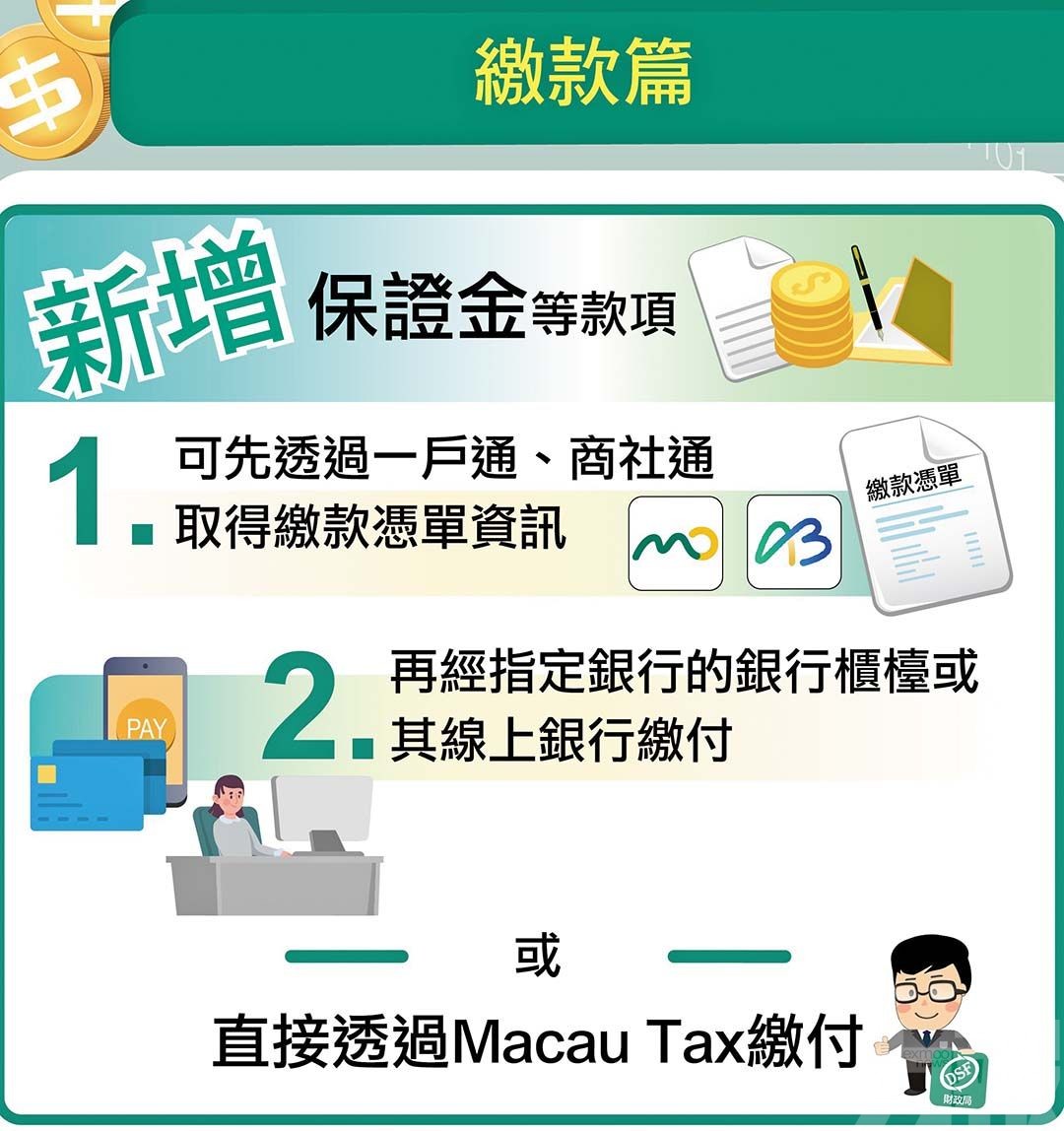 除上述收款服務外,財政局亦優化了繳付保證金等款項的流程。自2026年1月起,付款人可登入「一戶通」或「商社通」查閱繳款憑單,隨後透過指定銀行的櫃檯、網上銀行繳付;或直接通過「Macau Tax」以電子方式透過指定銀行繳納。