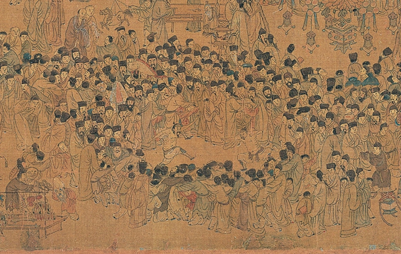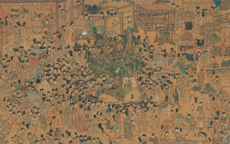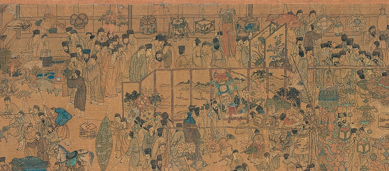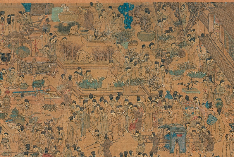 画卷右侧展现的是东市景象,此处多为花鸟盆景、珍禽异兽。不同于西市的喧闹,东市更显文人雅趣。南京夫子庙门口自古就是古董市场,画面中集中描绘了中国文人的生活状态:有画廊展示字画,有说书人讲述故事,更有文人雅士赏玩紫檀家具、雨花石、盆景等雅物。养水仙花、买假山石、养金鱼、养梅花、养兰花……尽显明代文人的生活情趣。