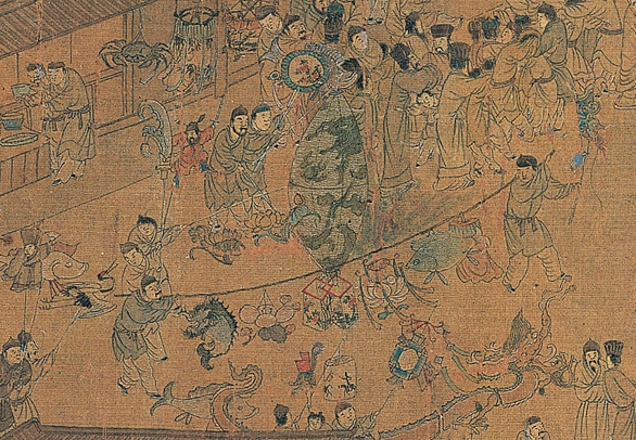 两名货郎肩挑各式花灯,下方正在舞龙