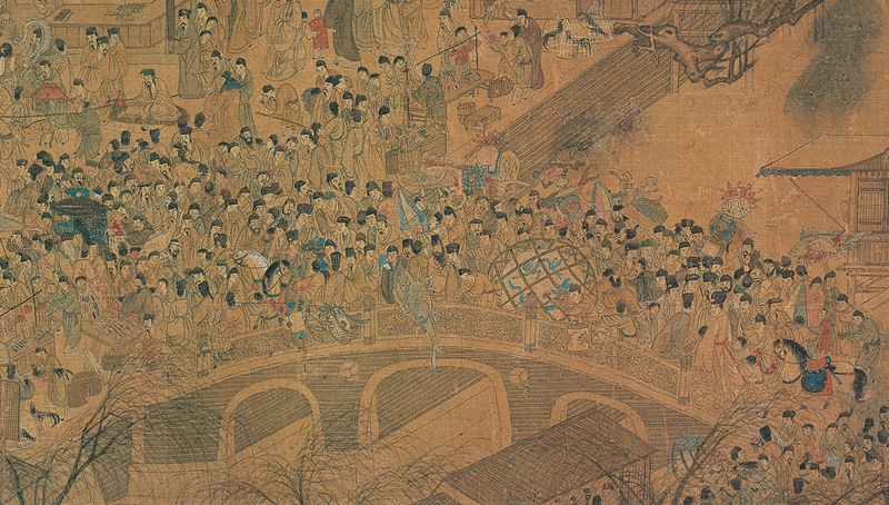 画卷左侧以三孔石桥为地理坐标,经学者杨新考据,此乃南京城南地标内桥,桥北为明代吴王府旧址。桥面摩肩接踵,百姓扶老携幼提灯过桥,代表着“走百病”的古俗——元宵夜妇女着盛装逢桥必过,祈愿祛除病灾。