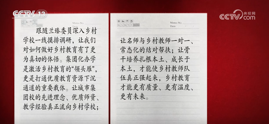 兰臻表示,她来自基层,教育均衡始于资源均衡,成于师资均衡。她将努力推动集团化办学一系列措施落地,引领乡村教师专业成长,让每一个乡村孩子都能享有更加优质的教育。【记者手记】跟随兰臻委员深入乡村学校一线摸排调研,让我们对如何做好乡村教育有了更为真切的体悟。集团化办学是激活乡村教育的“领头雁”,更是打通优质教育资源下沉通道的重要载体。