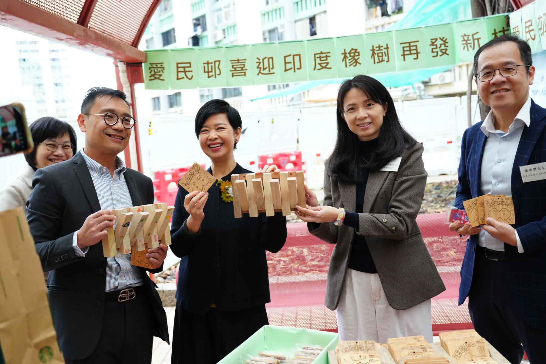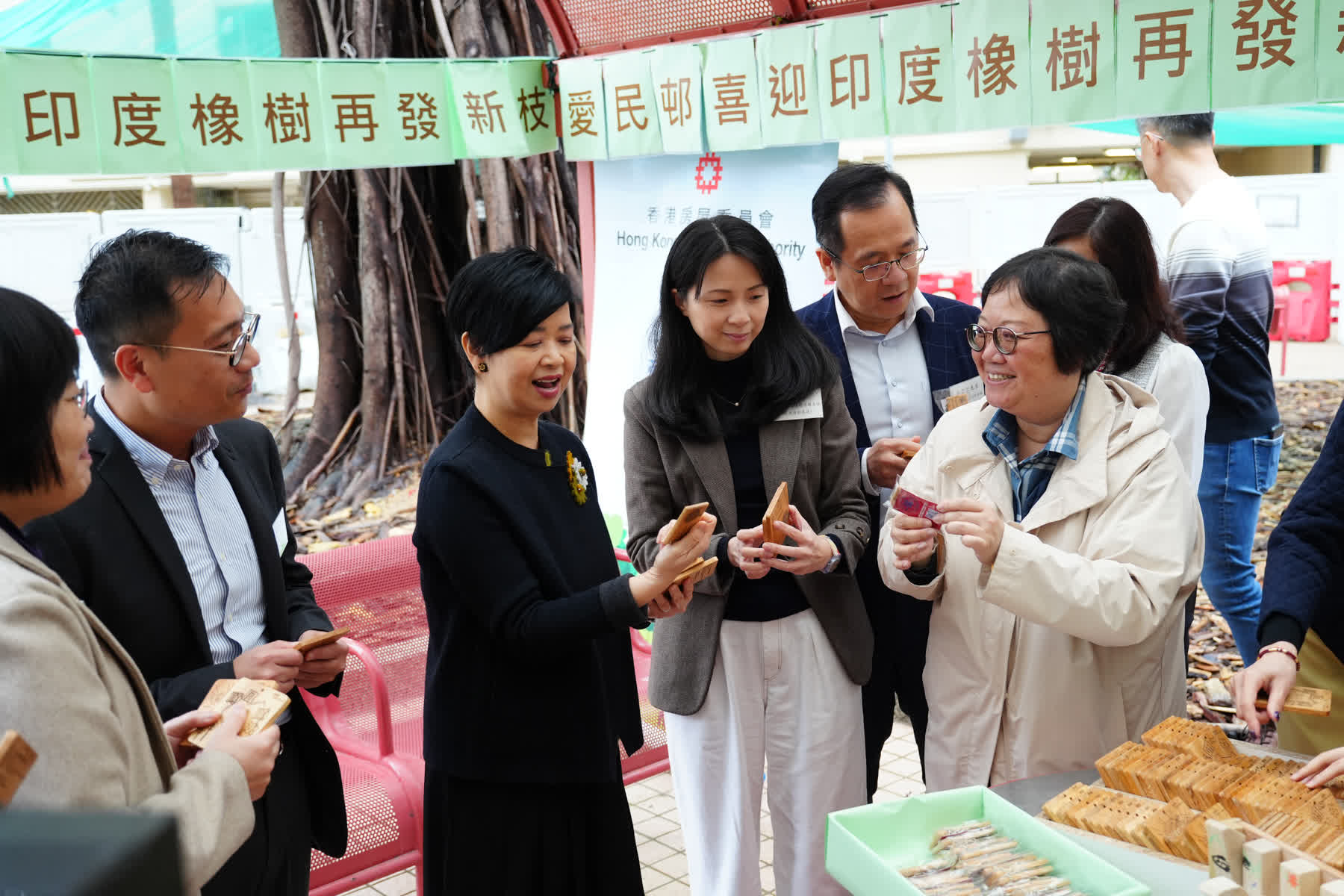 團隊與環保署、懲教署合作,用當日倒下的枝幹,製成一件件木製飾品,一個個印有幸福家族成員圖案的杯墊,及印有該印度橡樹的鎖匙扣,作為紀念品向邨內居民派發,讓大家共同記下這特別的愛民故事。