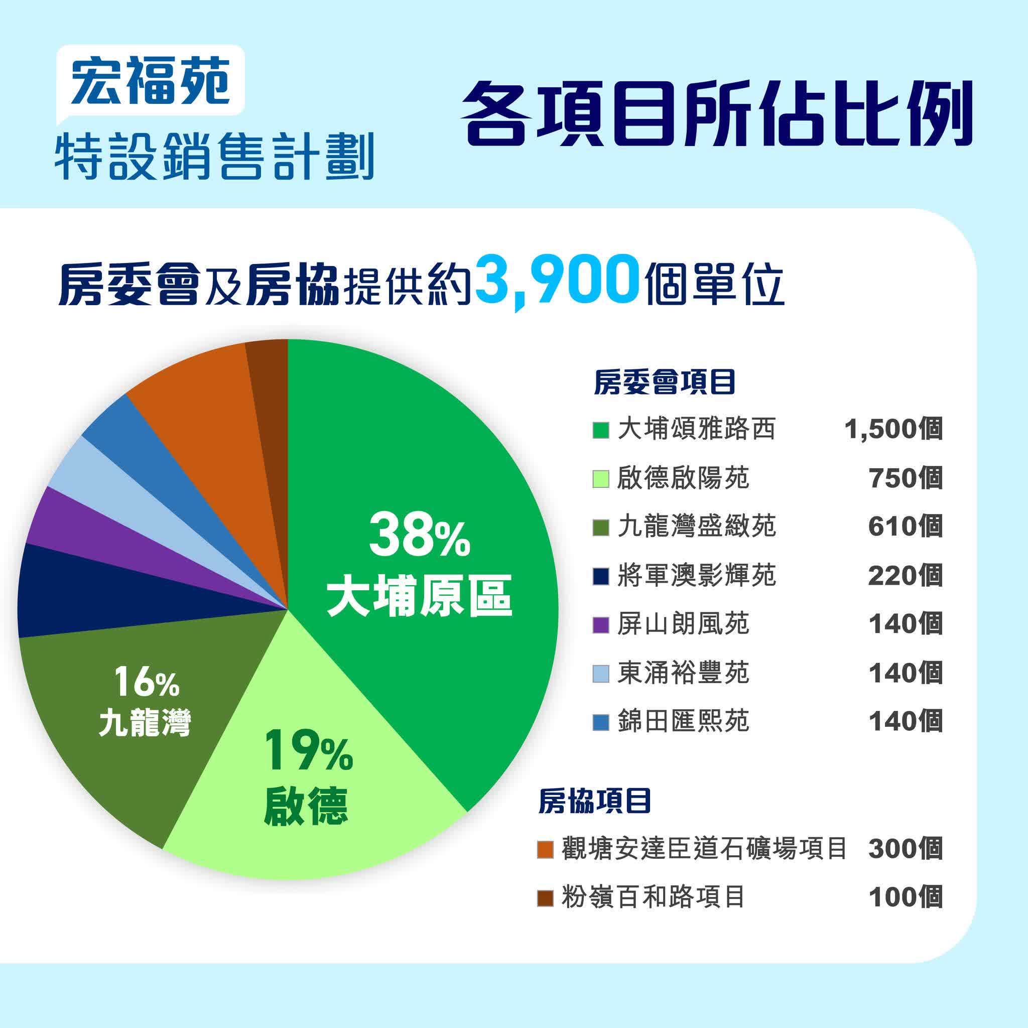 在地區分布方面,原區大埔佔整體約38%,啟德佔約19%,九龍灣佔約16%,三者合共2860個單位,參考問卷調查結果,地點都比較貼合大部分宏福苑業主的需求。