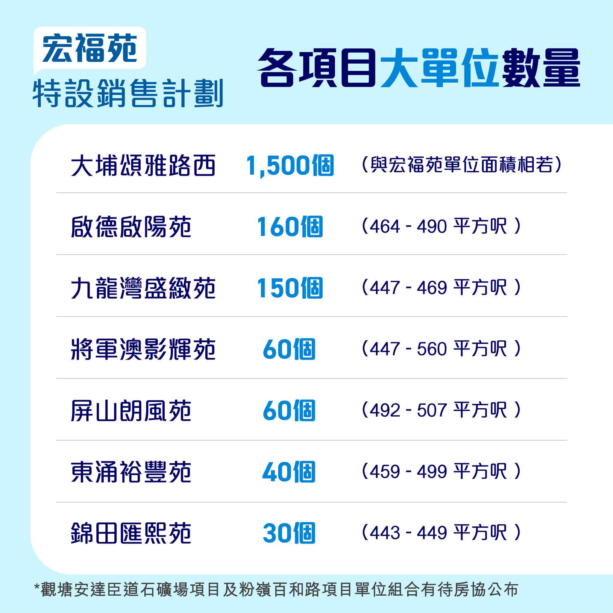 當中,房委會在大埔原區頌雅路西的項目,約1500個單位全數為大單位,以滿足原區及大單位的需求;其他各區亦有500個大單位,單是啟德和九龍灣已超過300個。未來房協公布其粉嶺百和路項目和觀塘安達臣道石礦場項目的單位組合後,必定會突破2000個大單位的總數。
