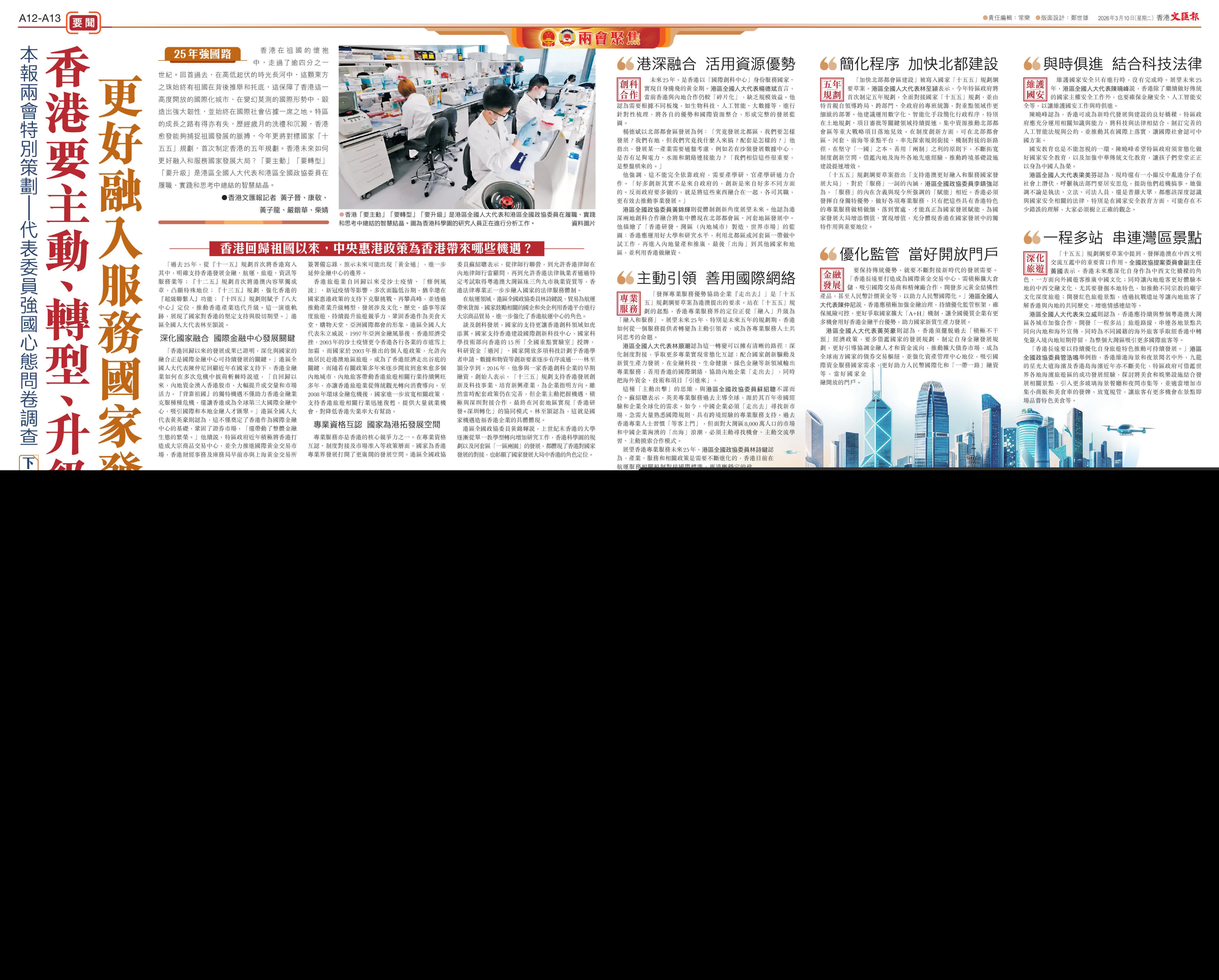 (香港文匯報記者 黃子晉、康敬、黃子龍、嚴鍇華、柴婧)香港在祖國的懷抱中,走過了逾四分之一世紀。回首過去,在高低起伏的時光長河中,這顆東方之珠始終有祖國在背後推舉和托底,這保障了香港這一高度開放的國際化城市,在變幻莫測的國際形勢中,鍛造出強大韌性,並始終在國際社會佔據一席之地。特區的成長之路有得亦有失,歷經歲月的洗禮和沉澱,香港愈發能夠捕捉祖國發展的脈搏,今年更將對標國家「十五五」規劃,首次制定香港的五年規劃。香港未來如何更好融入和服務國家發展大局?「要主動」「要轉型」「要升級」是港區全國人大代表和港區全國政協委員在履職、實踐和思考中總結的智慧結晶。