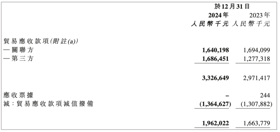 数据显示,截至2024年末,建业新生活的贸易应收款项达33.27亿元,其中来自第三方的应收款占比首次突破50%。当期,其贸易应收款减值拨备约13.65亿元。