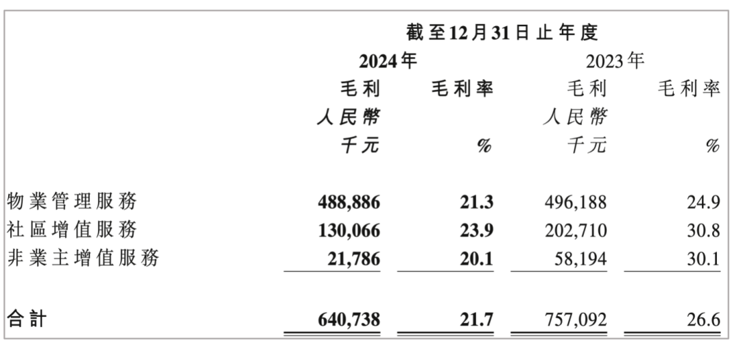 2024年,建业新生活整体毛利率约为26.6%。具体到三大业务板块,物业管理服务、社区增值服务,以及非业主增值服务的毛利率分别约为21.3%、23.9%、20.1%,较前一年均有所下滑。