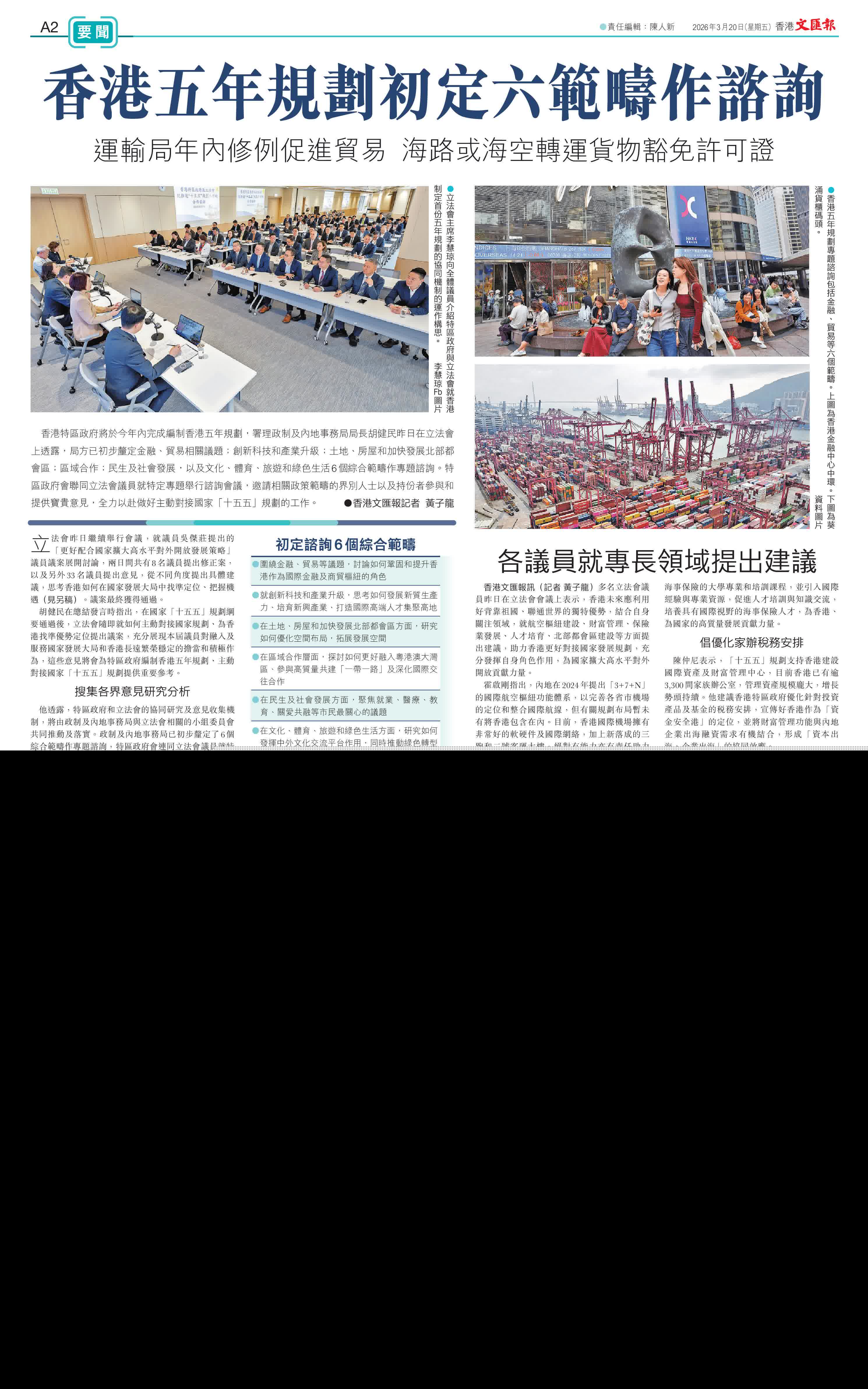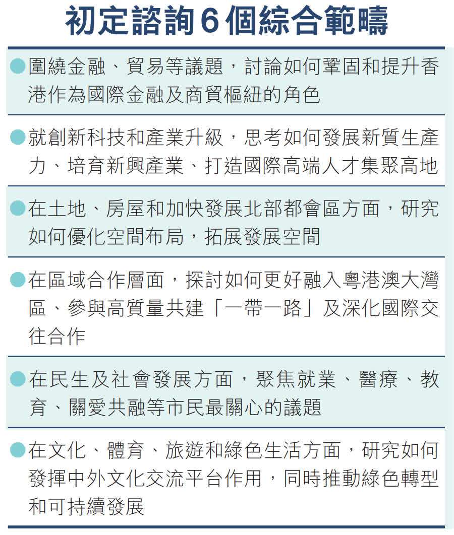 (香港文匯報記者 黃子龍)香港特區政府將於今年內完成編制香港五年規劃,署理政制及內地事務局局長胡健民昨日在立法會上透露,局方已初步釐定金融、貿易相關議題;創新科技和產業升級;土地、房屋和加快發展北部都會區;區域合作;民生及社會發展,以及文化、體育、旅遊和綠色生活6個綜合範疇作專題諮詢。特區政府會聯同立法會議員就特定專題舉行諮詢會議,邀請相關政策範疇的界別人士以及持份者參與和提供寶貴意見,全力以赴做好主動對接國家「十五五」規劃的工作。