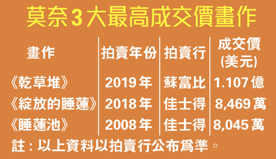 若講到莫奈眾多幅《睡蓮》畫作的最高拍賣成交價則屬於他晚年的《睡蓮》系列,如2018年佳士得拍賣中,一幅1914-1917年創作的《綻放的睡蓮》以約8,469 萬美元(約6.6億港元)成交。另一幅1919年創作的《睡蓮池》曾於2008年以8,045萬美元(約6.27億港元)在佳士得成交。至於莫奈畫作中,成交價最高的畫作則是1890年作品《乾草堆》(Meules),2019年在蘇富比以1.107億美元(約8.35億港元)成交。