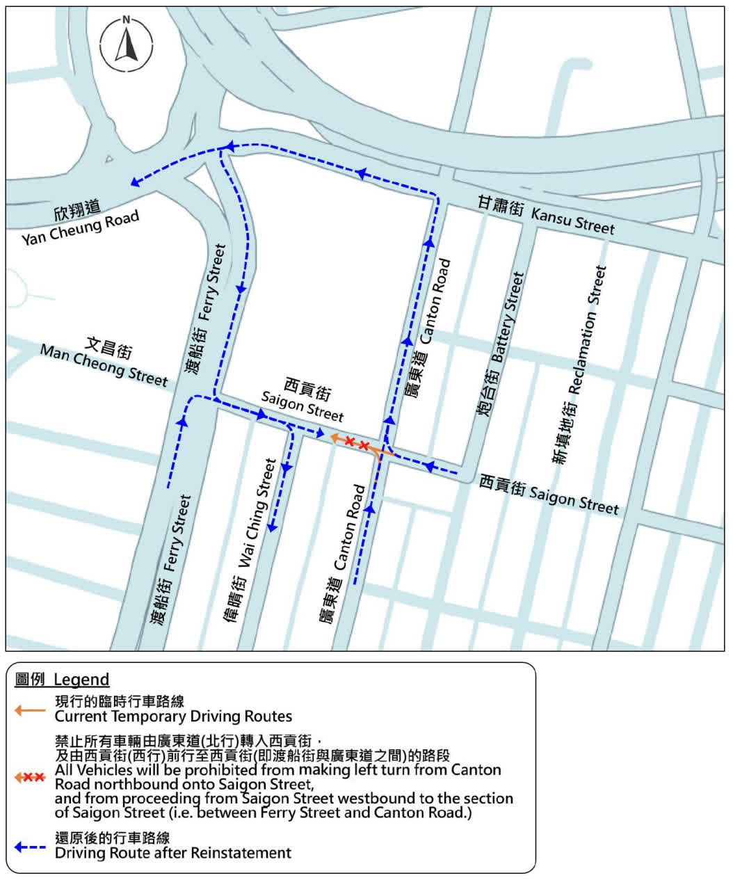 所有車輛將禁止由廣東道(北行)轉入西貢街,以及由西貢街(西行)前行至上述一段西貢街;沿西貢街(西行)或廣東道(北行)前往渡船街或偉晴街的車輛,須返回原有路線,即沿廣東道(北行)左轉至甘肅街(西行);及九龍專線小巴第3號線將恢復原有小巴站,營辦商會張貼告示通知乘客。