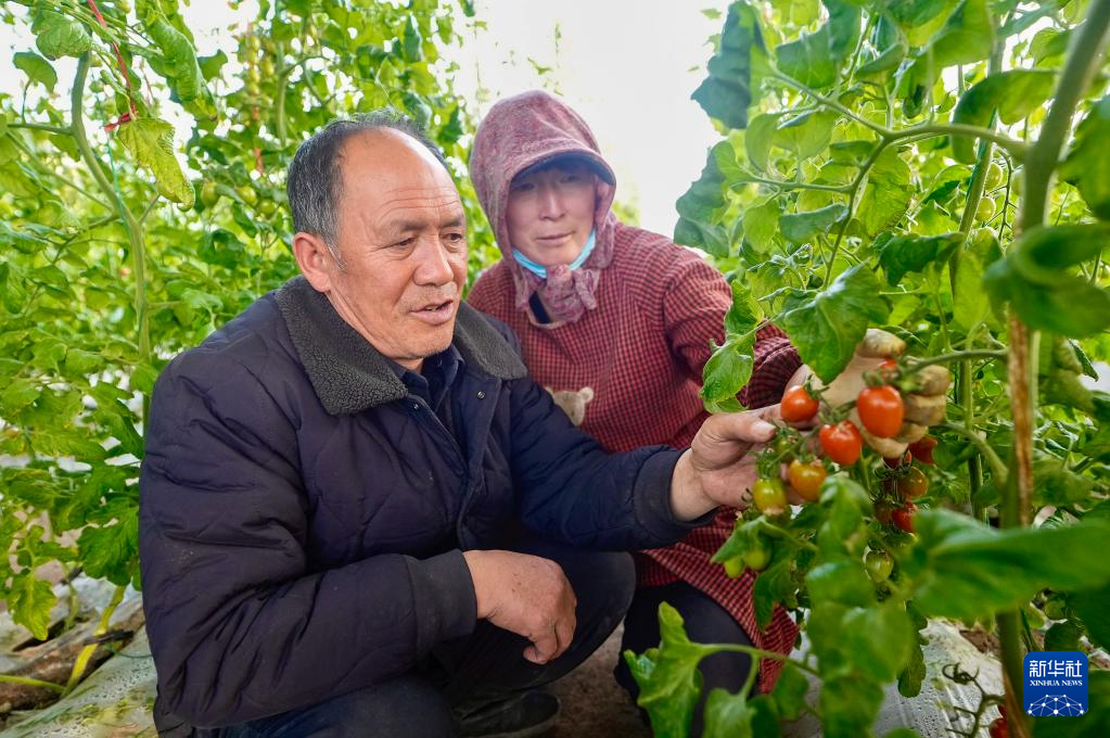 2月2日,宁夏固原市原州区彭堡镇姚磨村农业体验园的温室大棚内,王克忠夫妇查看番茄的生长情况。新华社记者 杨植森 摄