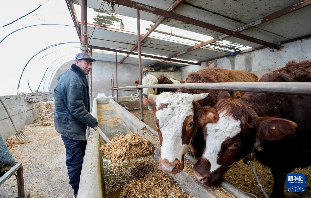 2月2日,宁夏固原市原州区彭堡镇惠德村村民马文军在家里喂牛。新华社记者 杨植森 摄