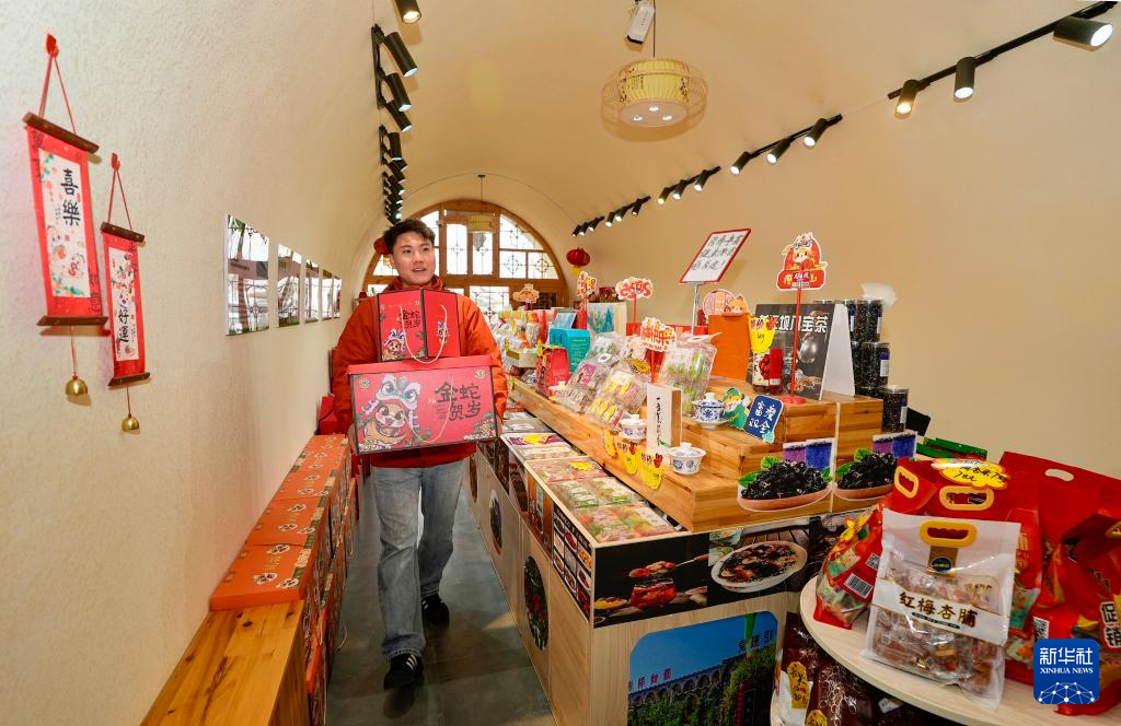 2月3日,宁夏固原市西吉县龙王坝村供销合作社内,工作人员搬运货物。新华社记者 杨植森 摄