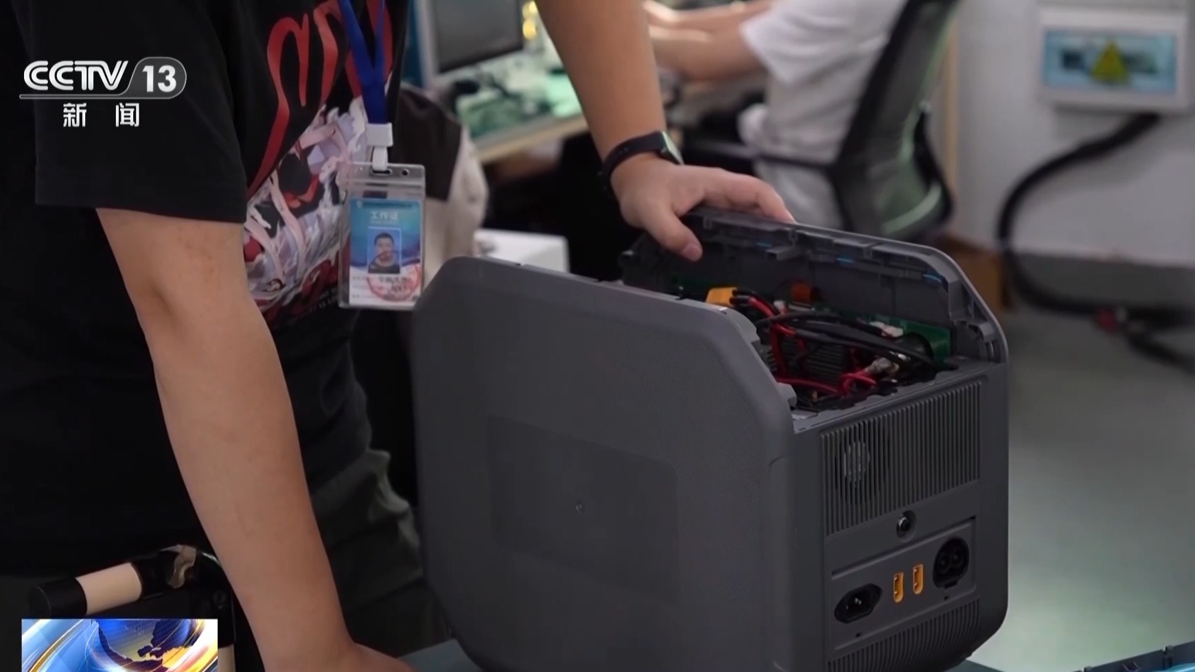 在企业生产车间里,记者看到的是一派繁忙的景象,一台台储能设备正在被组装、装车。这种移动储能设备一般长40厘米、宽20厘米、高20厘米,相当于一台小型打印机的体积。在欧洲和美国普遍被用于家庭的应急备电、户外用电等场景。一台电源能支持90%以上家电设备。