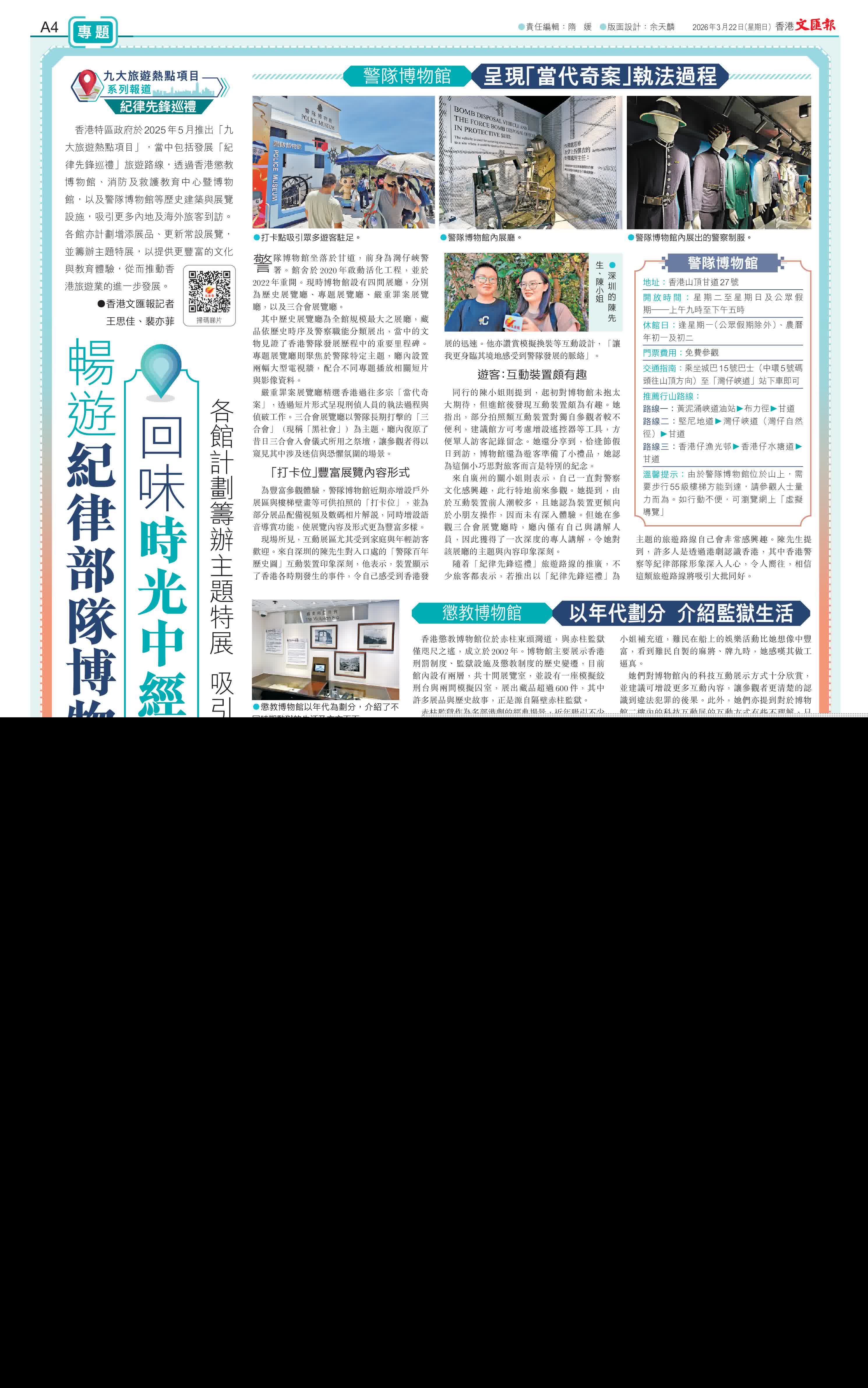 (香港文匯報記者王思佳、裴亦菲)香港特區政府於2025年5月推出「九大旅遊熱點項目」,當中包括發展「紀律先鋒巡禮」旅遊路線,透過香港懲教博物館、消防及救護教育中心暨博物館,以及警隊博物館等歷史建築與展覽設施,吸引更多內地及海外旅客到訪。各館亦計劃增添展品、更新常設展覽,並籌辦主題特展,以提供更豐富的文化與教育體驗,從而推動香港旅遊業的進一步發展。