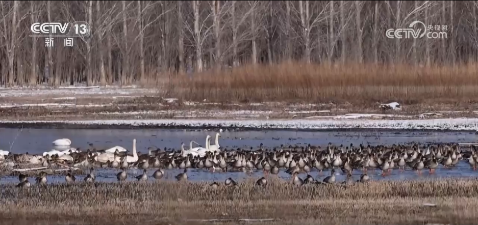 央视网消息:这几天,随着气温逐渐回升,北京地区迎来了春季候鸟迁徙高峰,成千上万只天鹅、白鹤以及雁鸭类等候鸟齐聚密云水库周边湿地等区域。