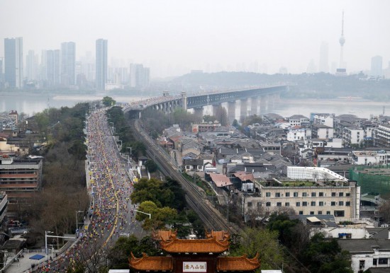 3月22日,2026武汉马拉松参赛选手经过黄鹤楼。新华社记者 伍志尊 摄